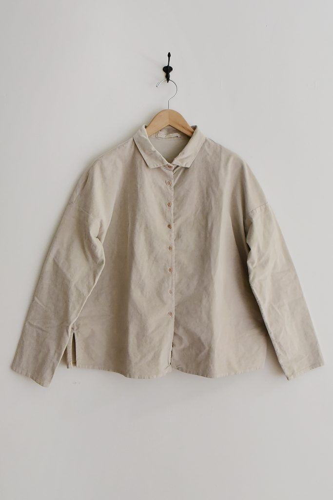 A signature piece from Album di Famiglia, this cropped velvet shirt is crafted from a soft cotton-elastane blend with a subtle stretch that feels lux to wear. Its boxy shape, small pointed collar, and delicate buttons create a modern yet relaxed look in an off-white hue with a gentle grey undertone.