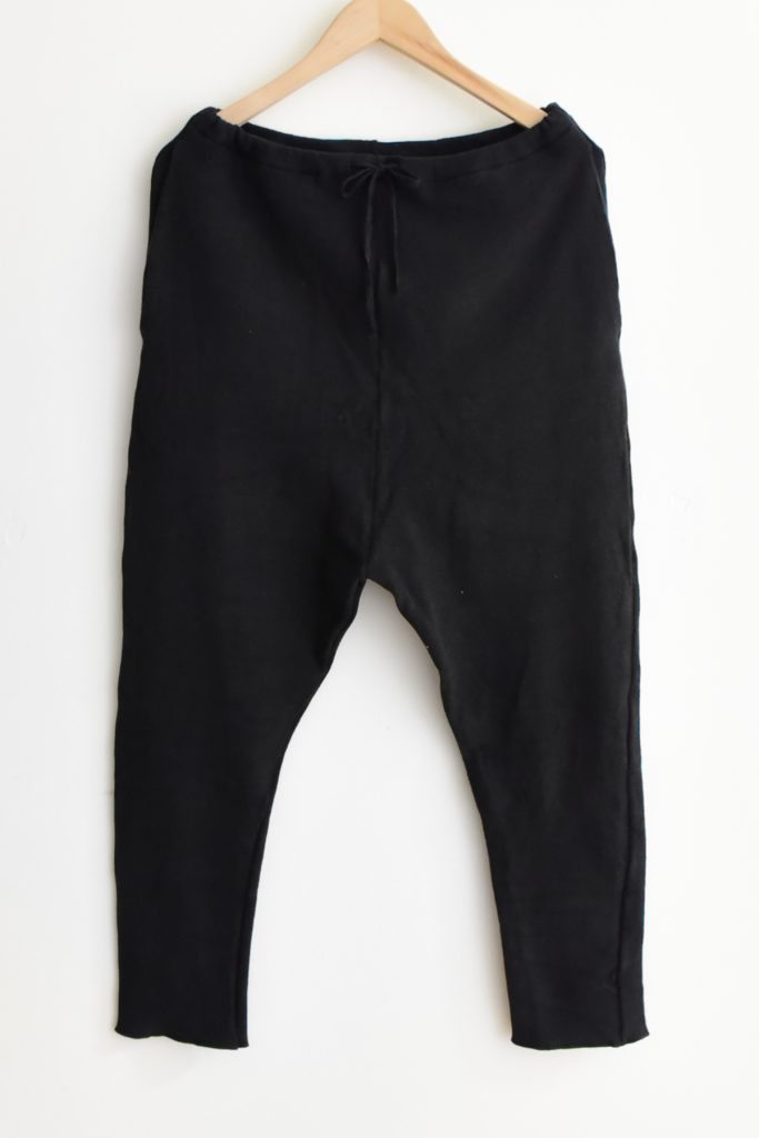Size XS: Elastic waist with ribbon 30″ (76cm), Front rise 15″ (38cm), Length 35″ (89cm), Leg opening Ø5″ (12.5cm)