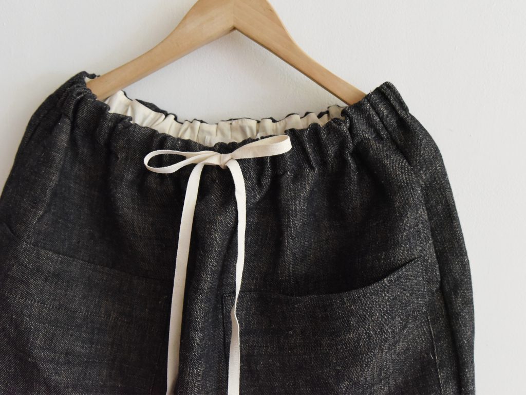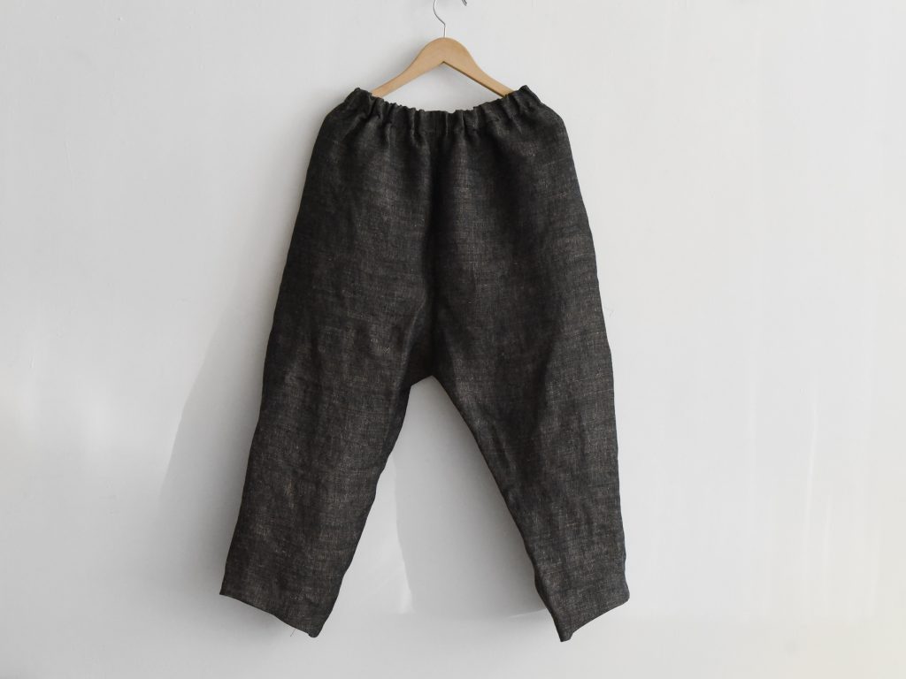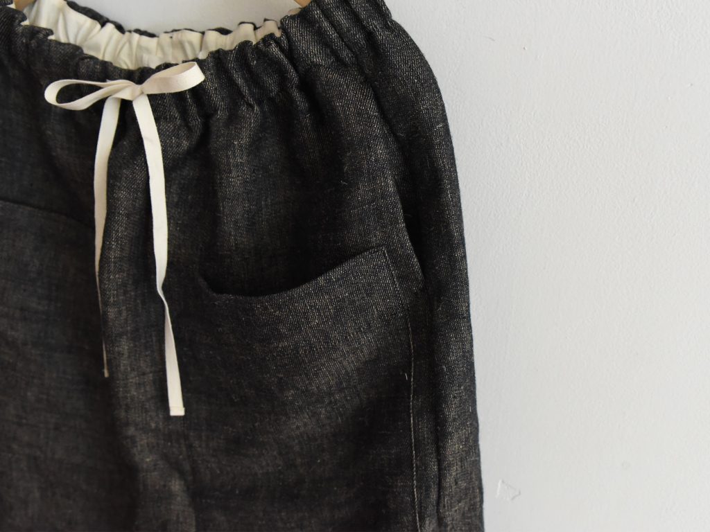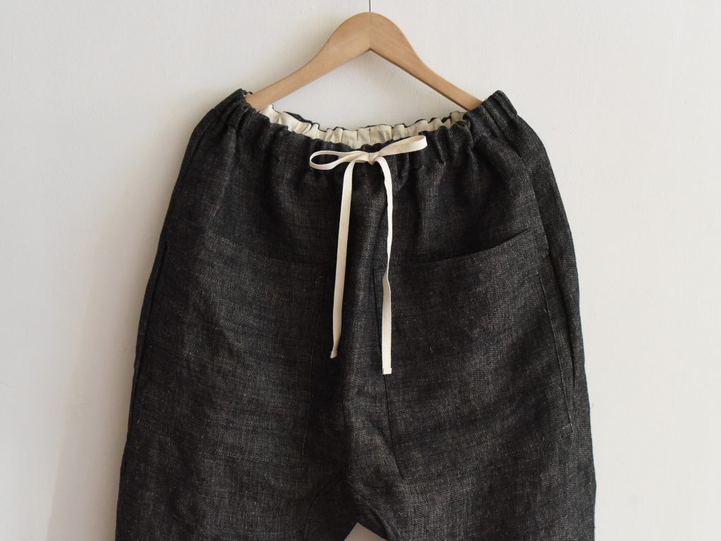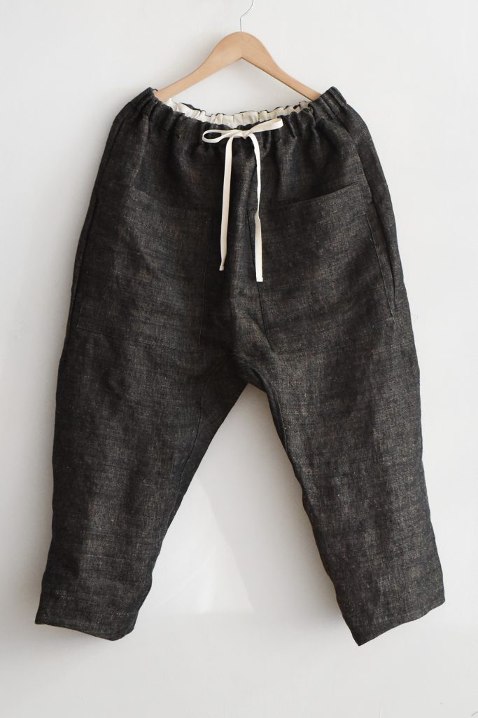 Pants made from 100% hemp and produced in Italy. Designed with an elastic waistband and adjustable drawstring closure. The style features two large patch pockets at the front and two side pockets, with no back pockets. The silhouette is slightly tapered toward the hem.