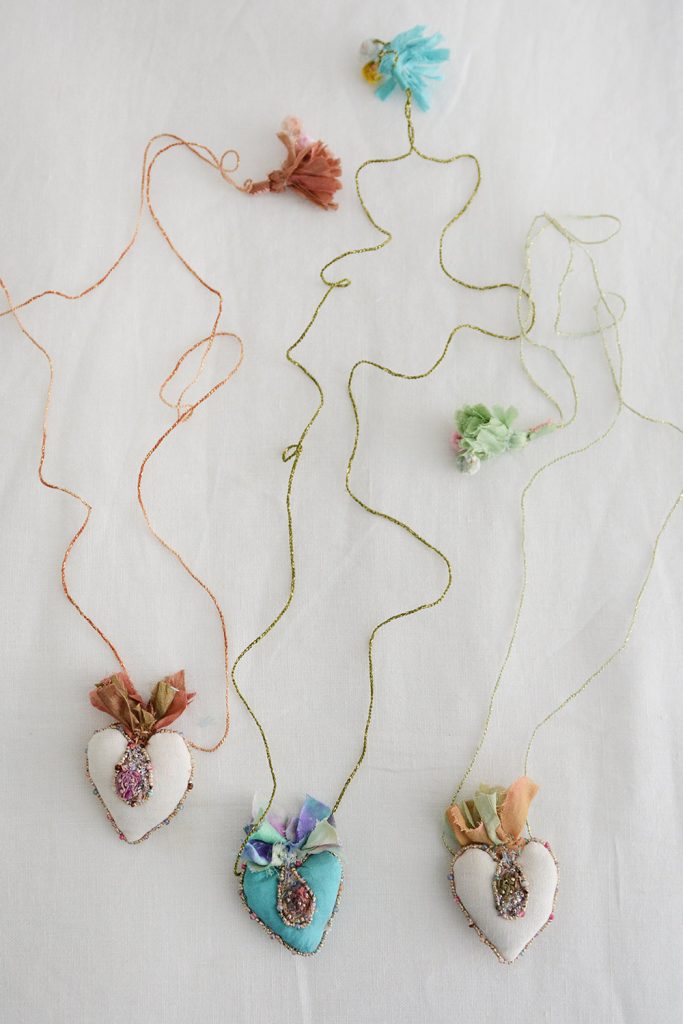 Embroidered hearts with silk, linen fabric and vintage Venetian beads.