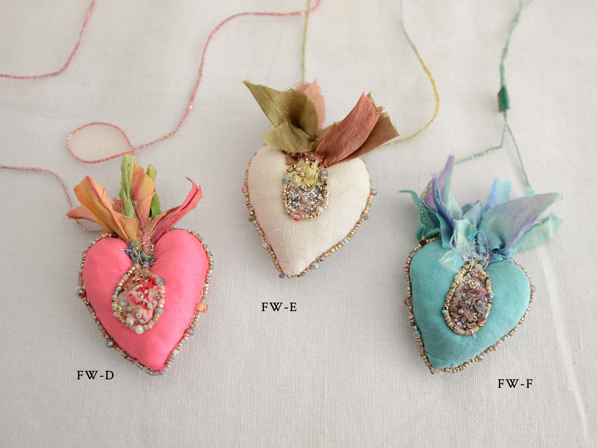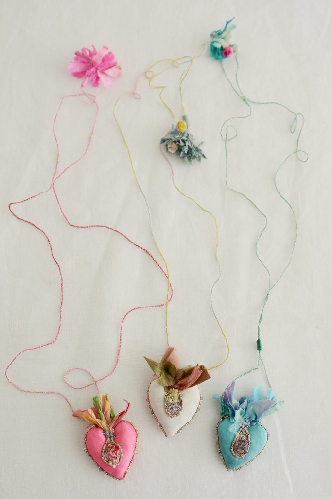 Embroidered hearts with silk, linen fabric and vintage Venetian beads.