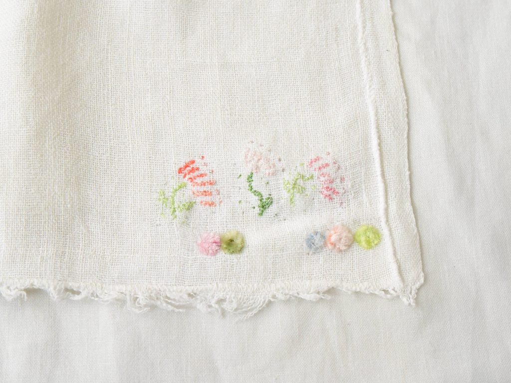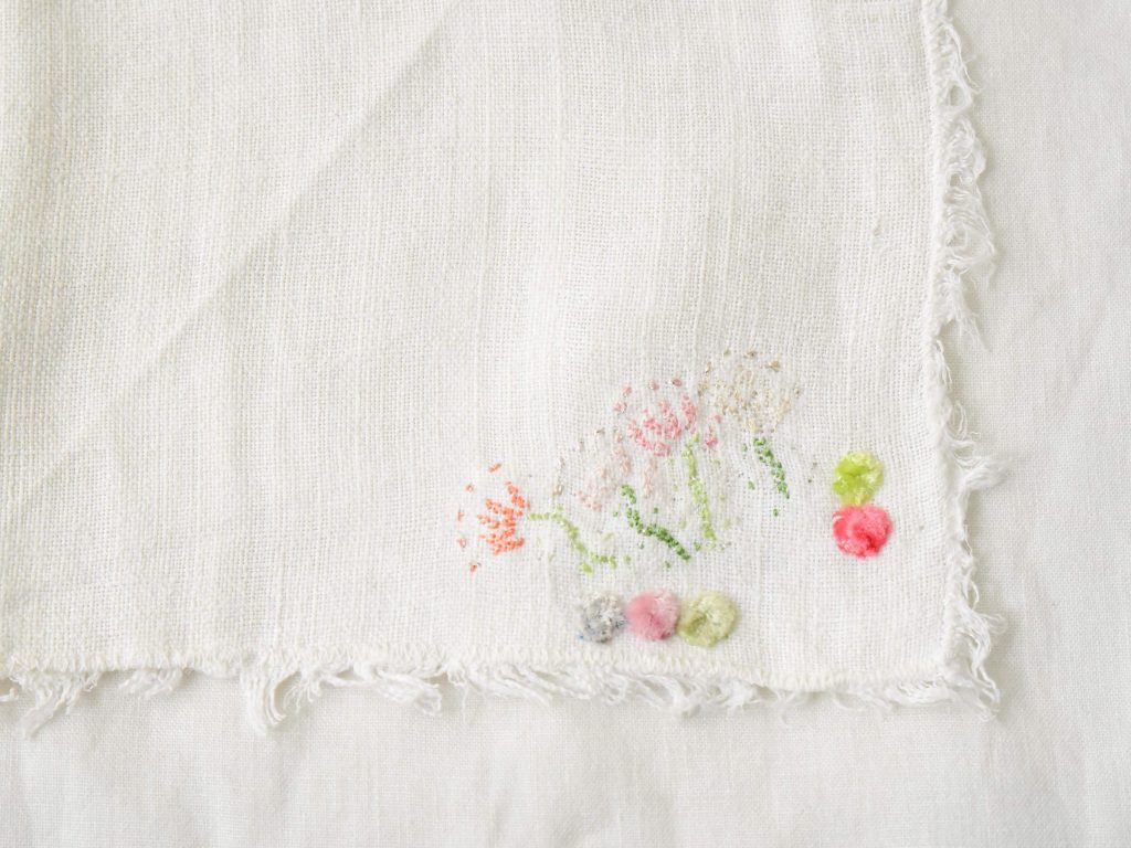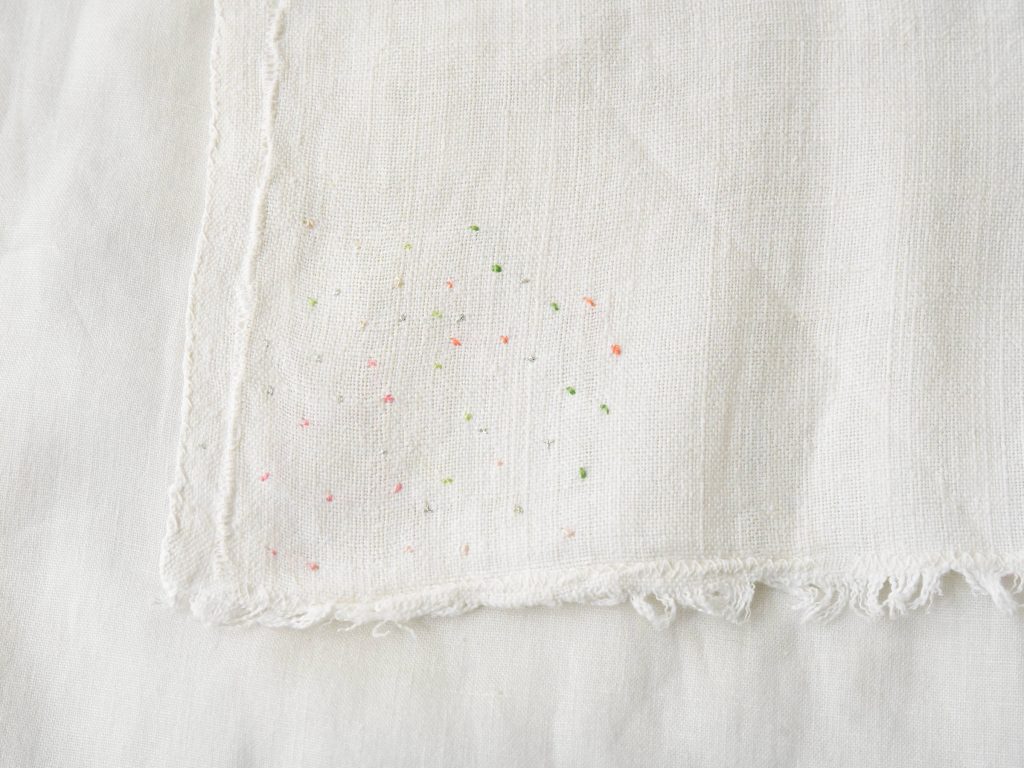 Embroidered on vintage linen napkins. A linen napkin featuring floral motifs on two corners and colorful, star-like dotted embroidery on the other two corners.