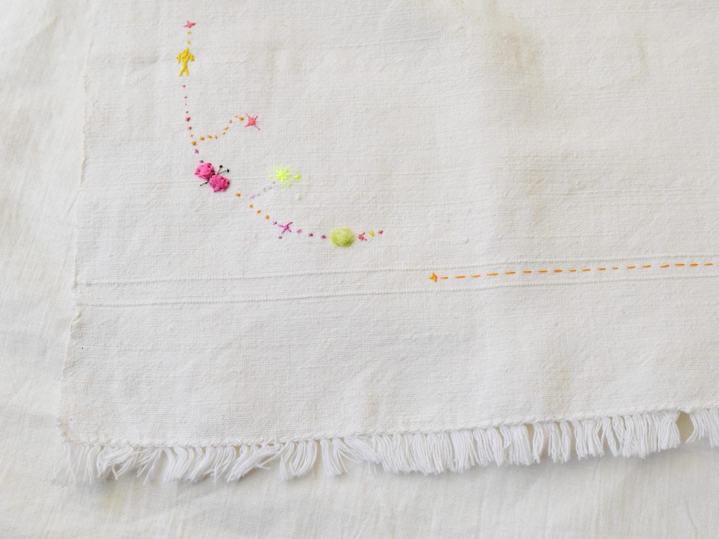Embroidered on vintage linen napkins. A linen napkin featuring delicate embroidered motifs such as butterflies, stars, and other small details along the edges. Each napkin has its own subtle character, adding a gentle decorative touch.
