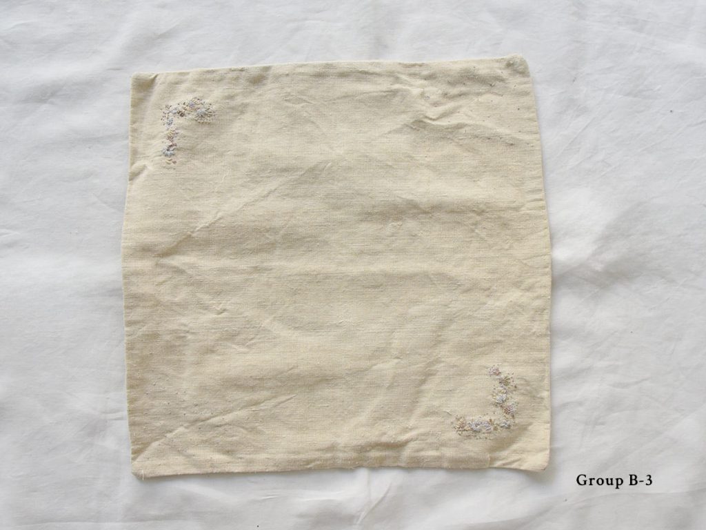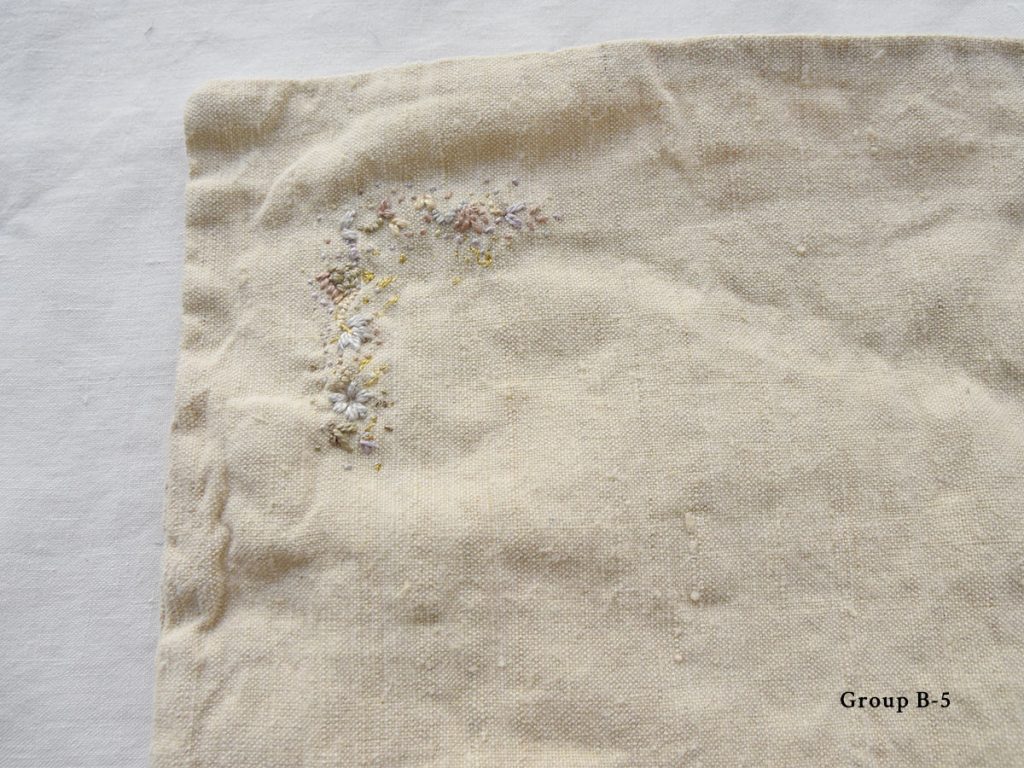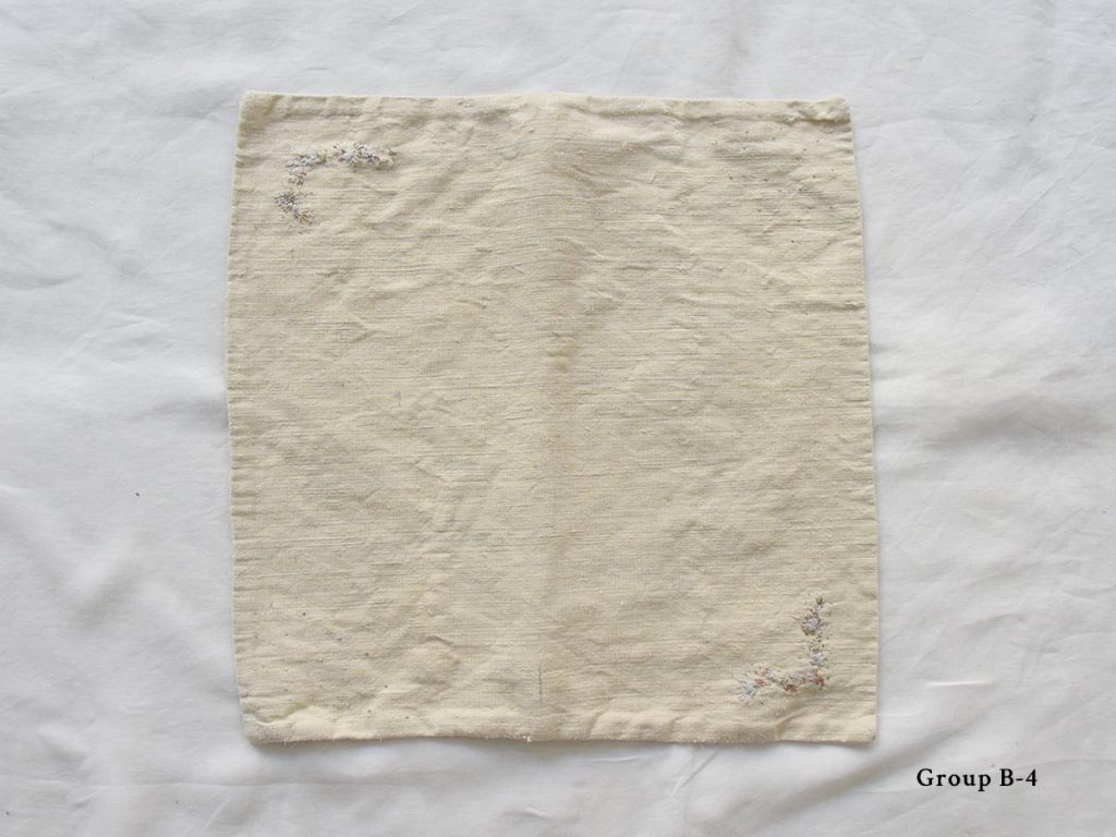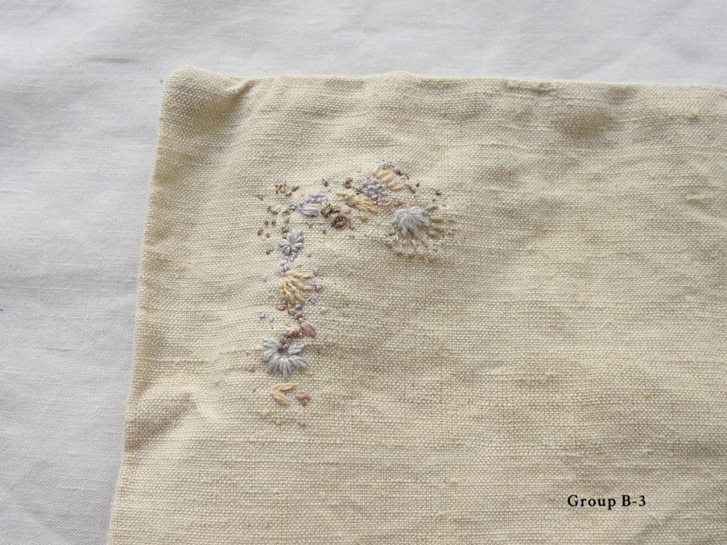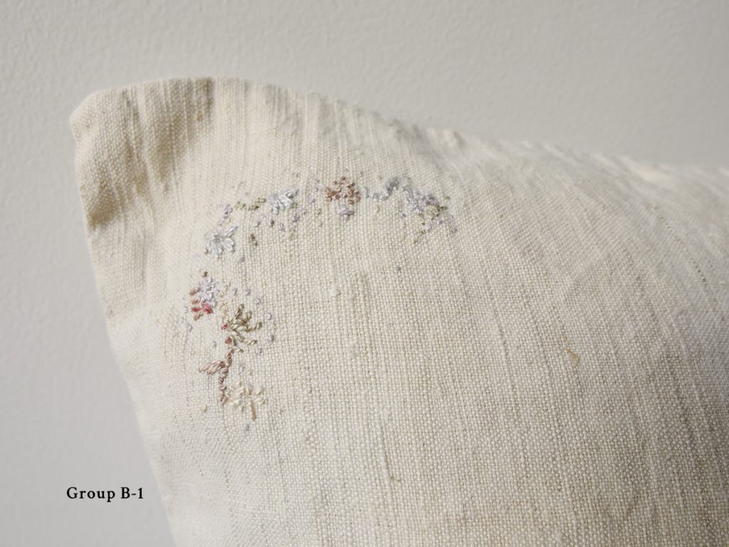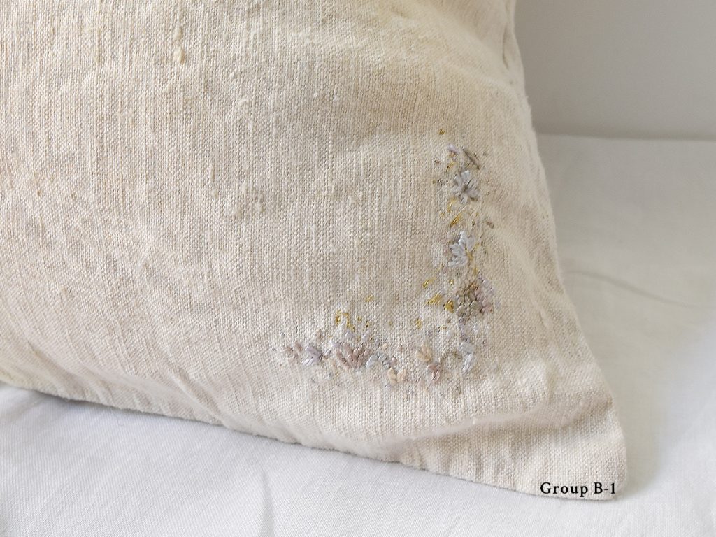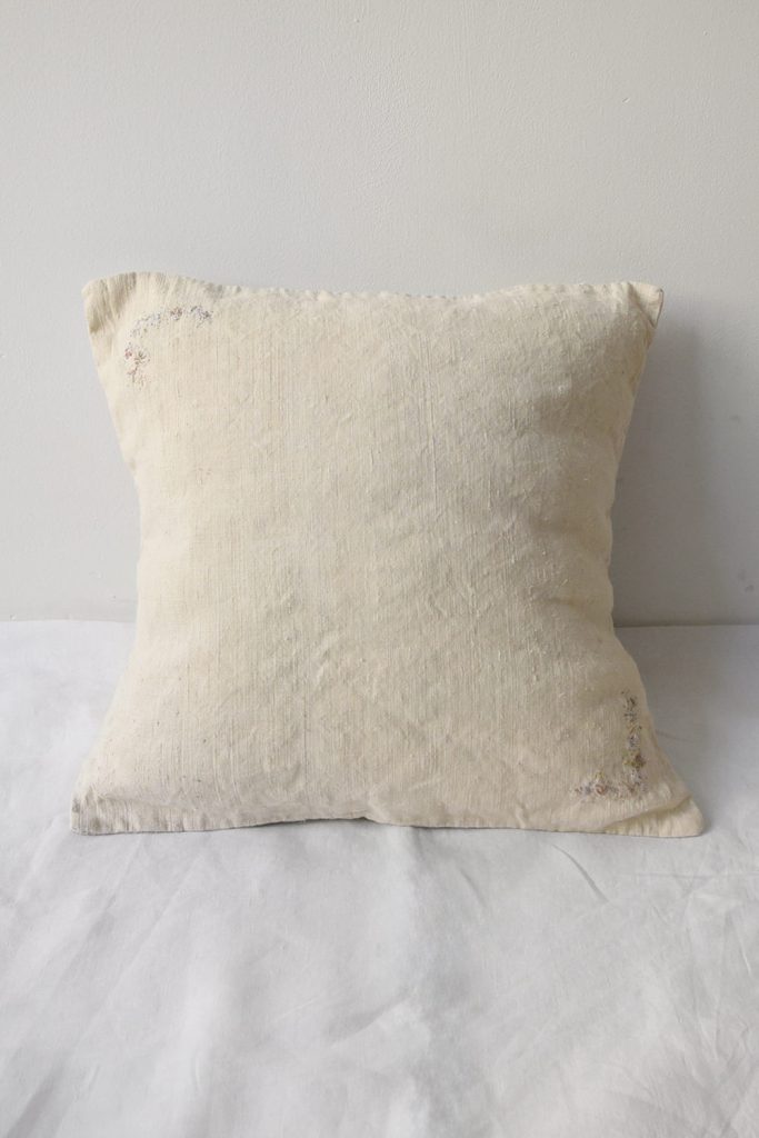 The linen pillow has flower-like embroidery on two corners and silver pastel dots on the other two corners. The back side is plain.