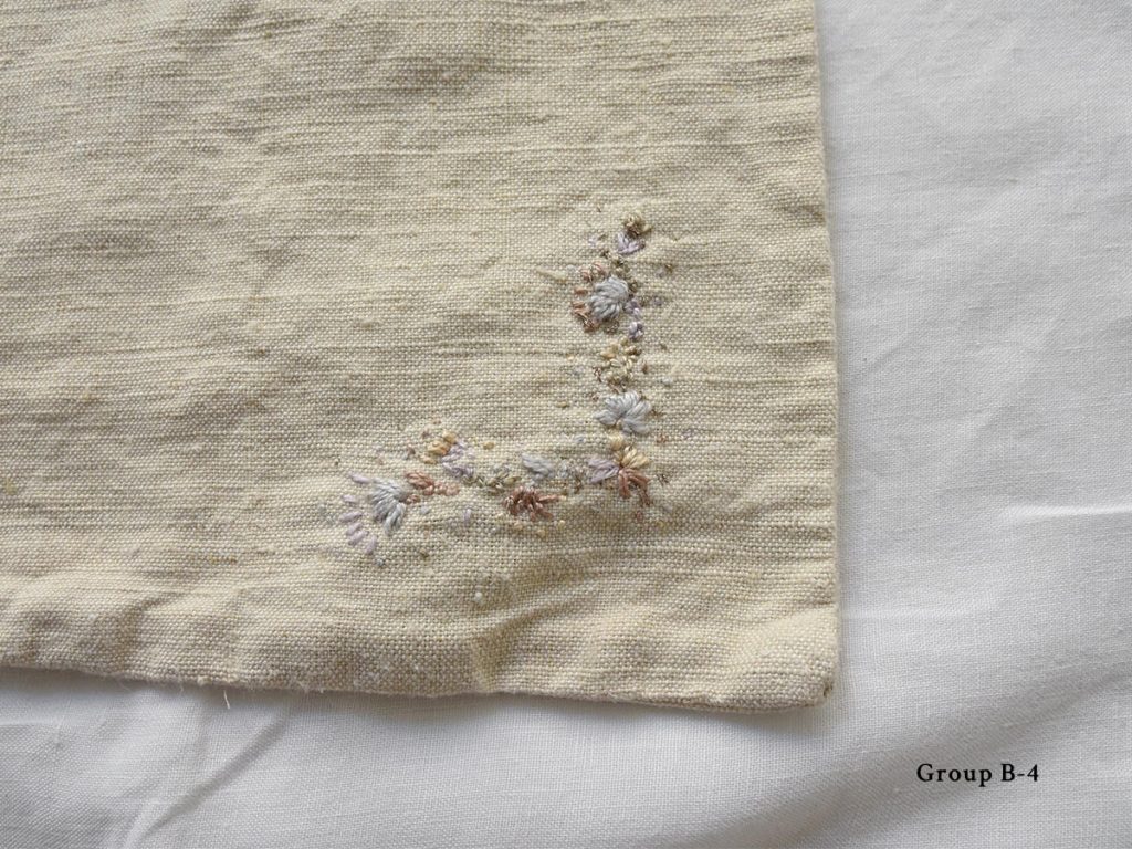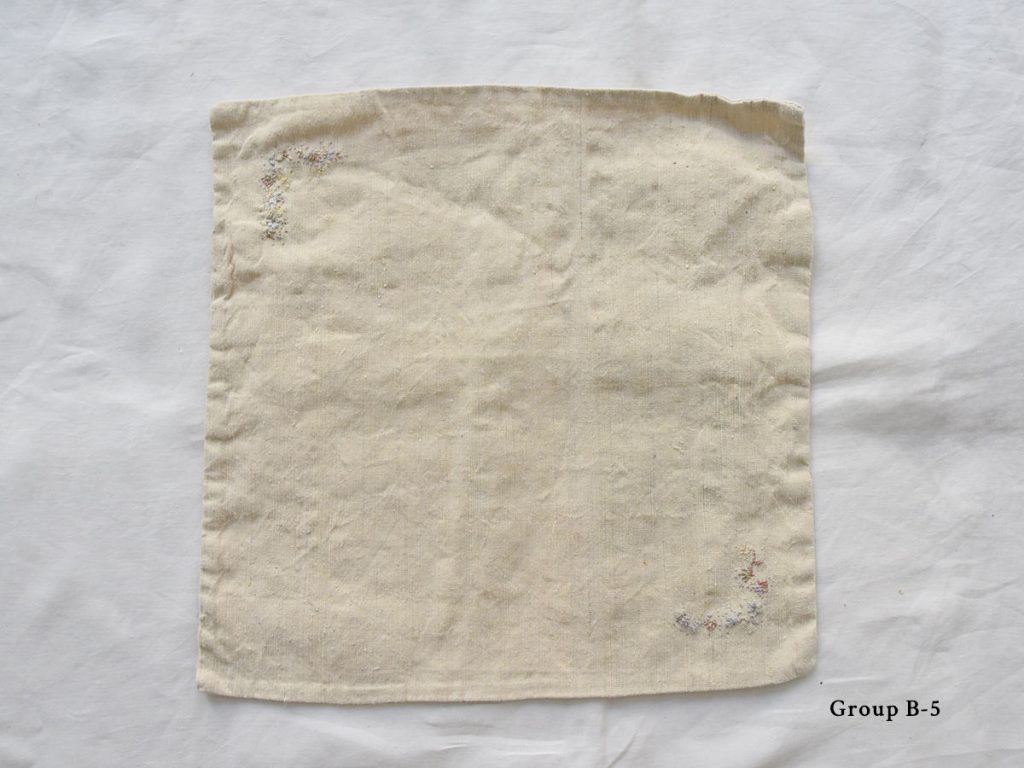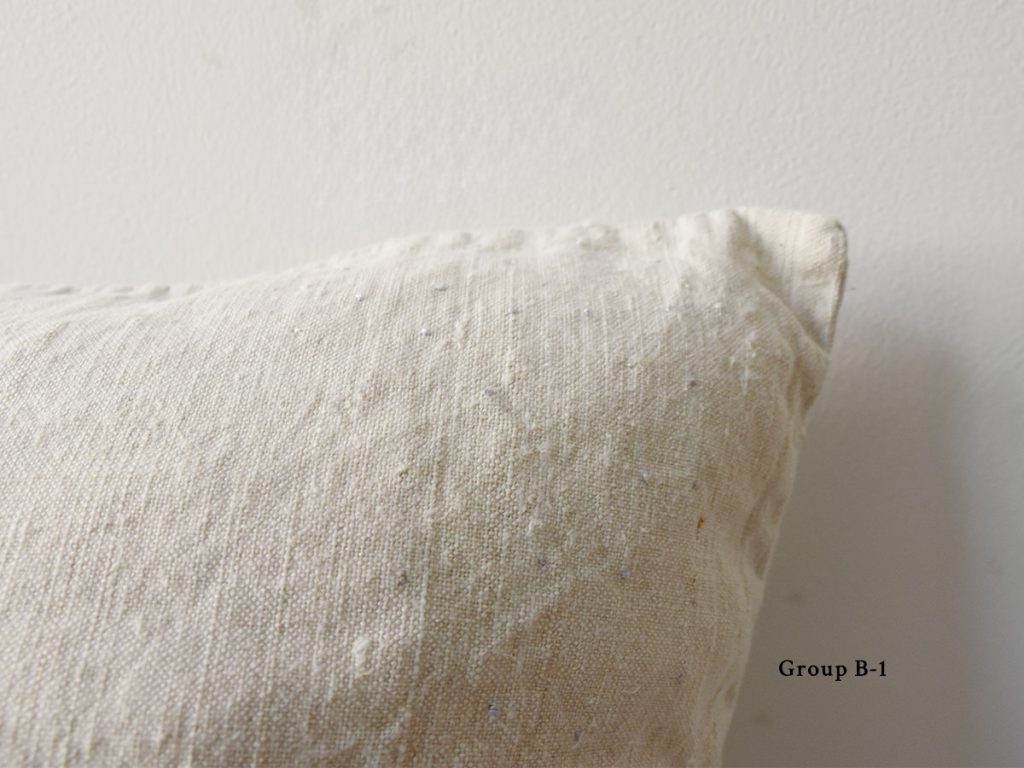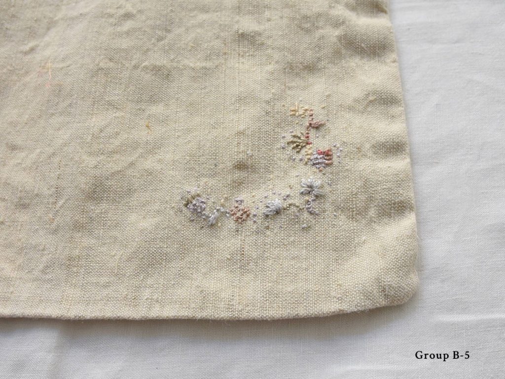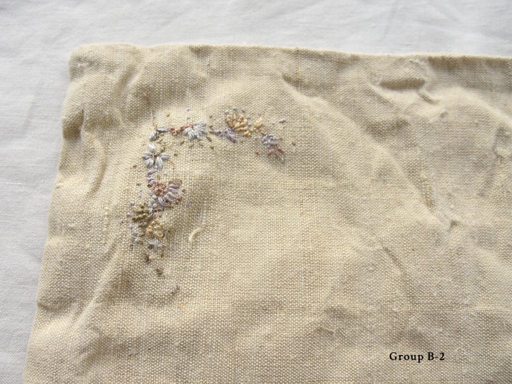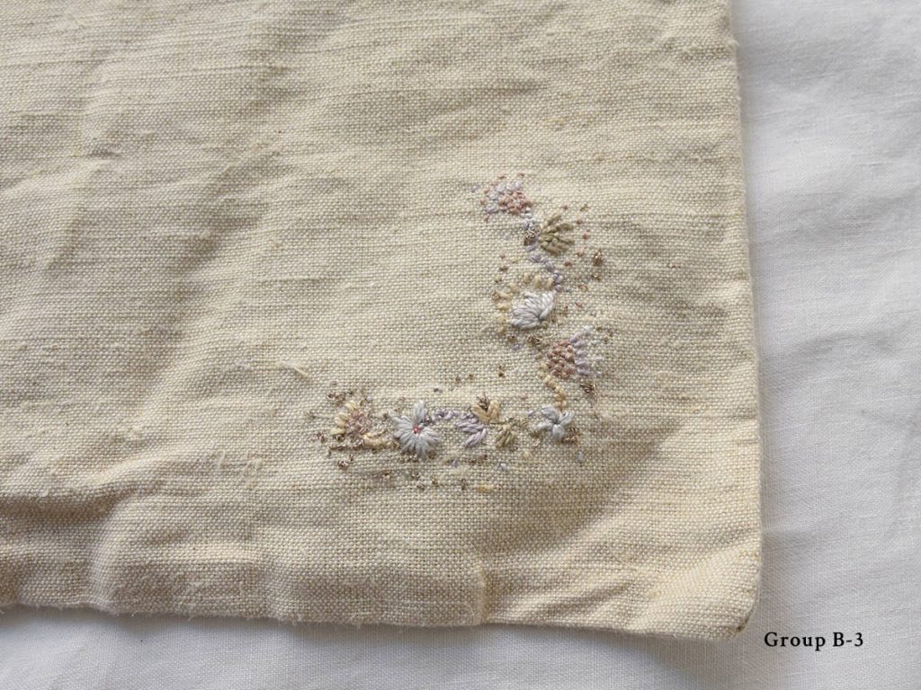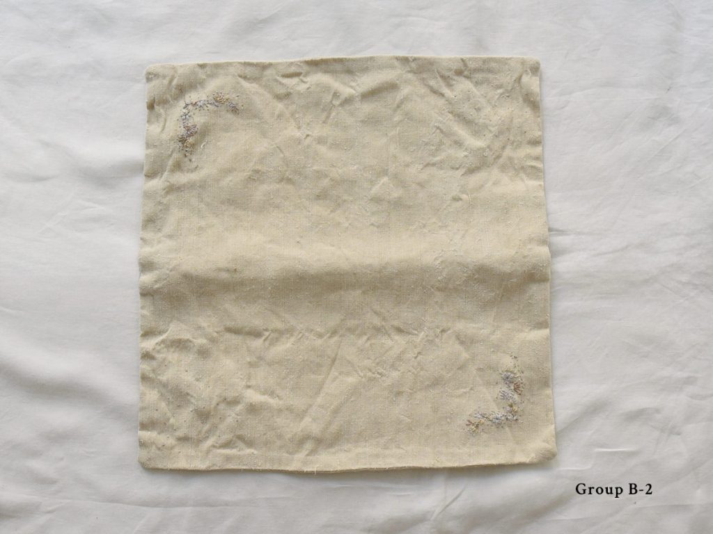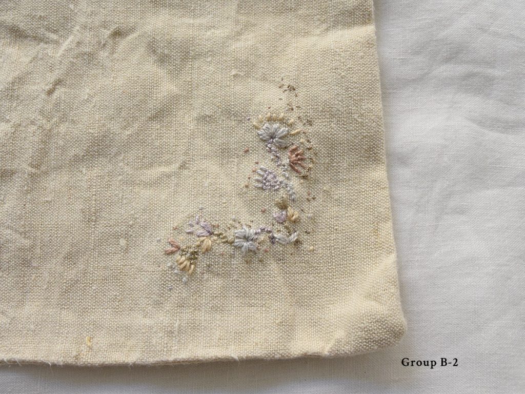 The linen pillow has flower-like embroidery on two corners and silver pastel dots on the other two corners. The back side is plain.