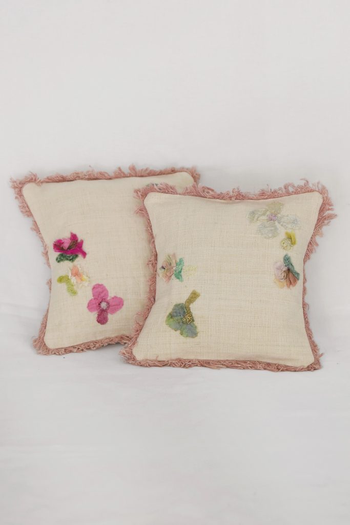 The linen pillow has embroidered on two corners using fabric and vintage beads. The back side is plain.