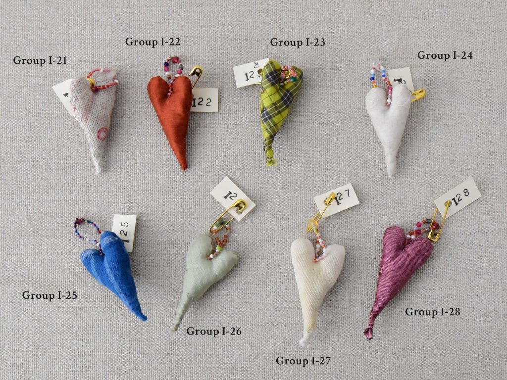 This is a narrow heart-shaped charm. It is crafted using vintage fabric and Venetian beads etc.