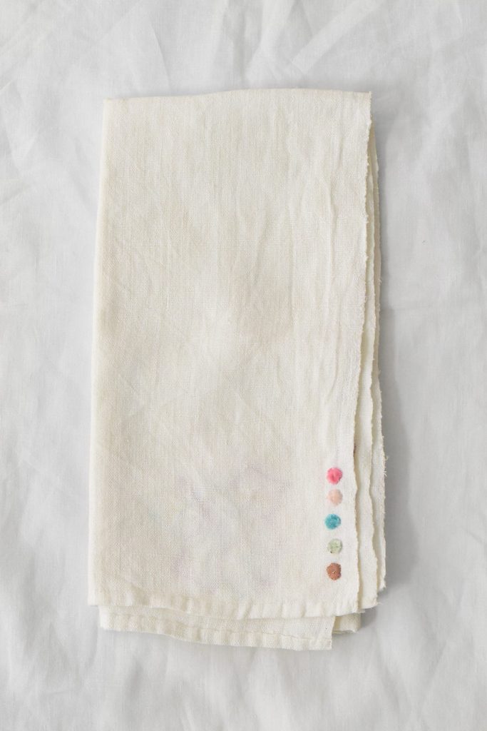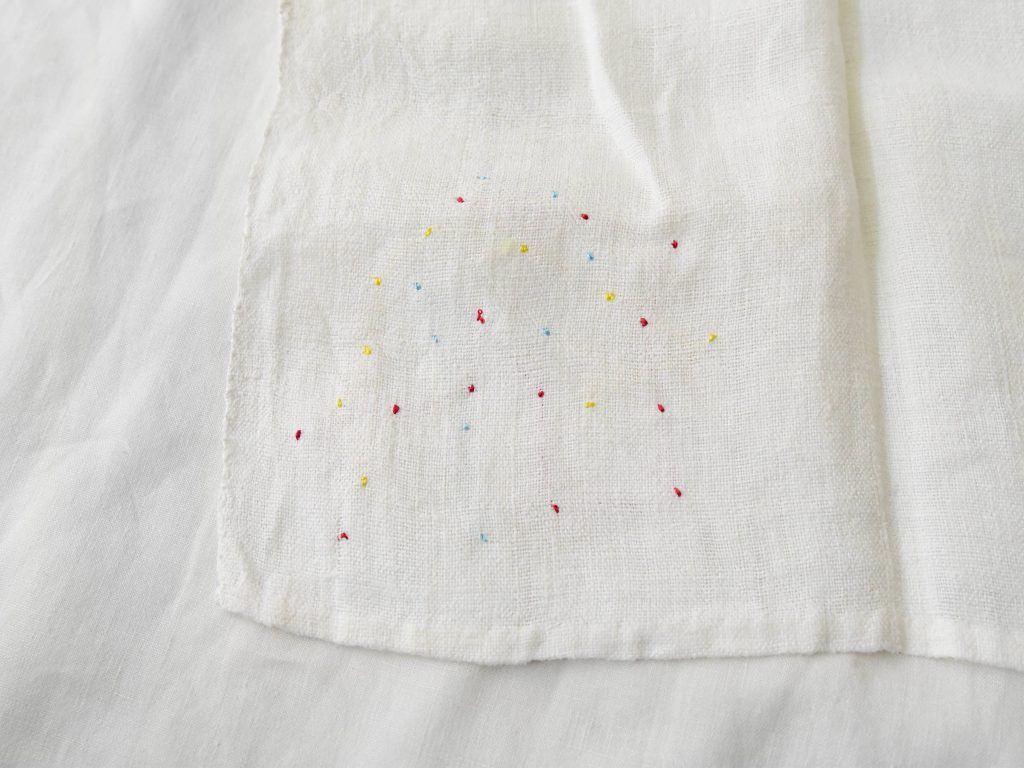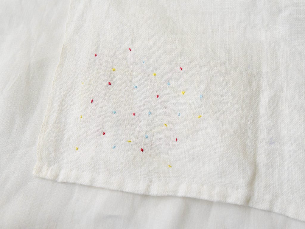 Embroidered on vintage linen napkins. A linen napkin featuring floral motifs on two corners and colorful, star-like dotted embroidery on the other two corners.