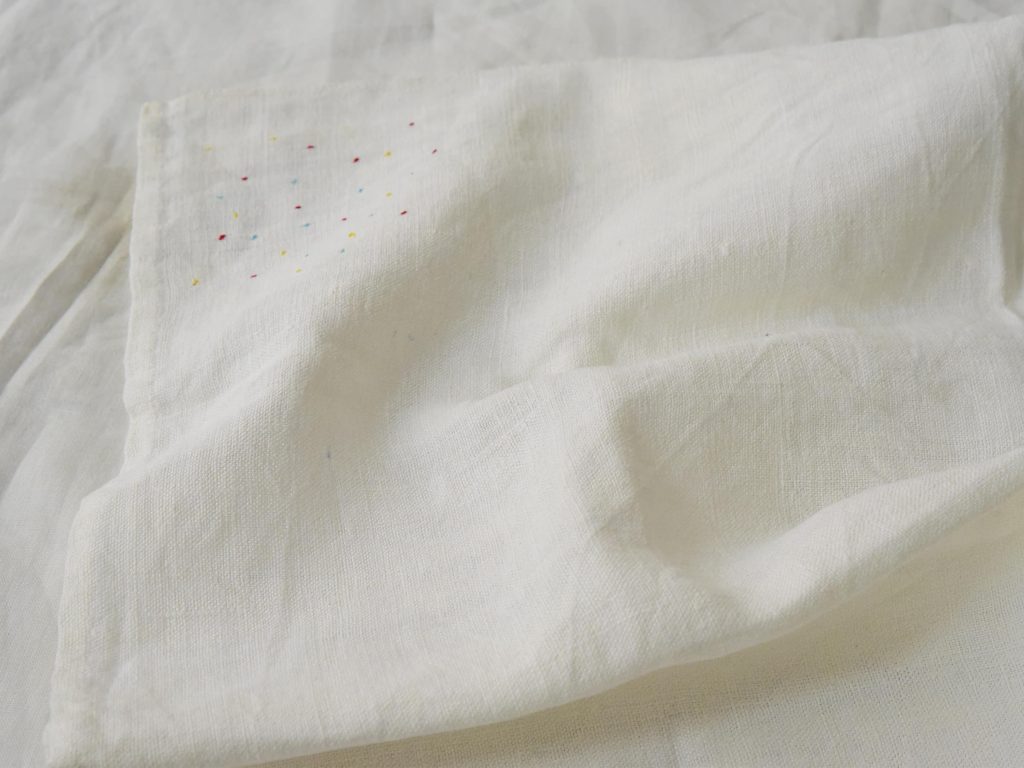 Each piece of line napkins may have imperfections that shall be considered characteristics that makes the object unique. It’s not a problem if the napkin gets wet, but there is a possibility of color fading, so please wash it separately. Additionally, we recommend covering the embroidered parts to prevent them from getting wet.