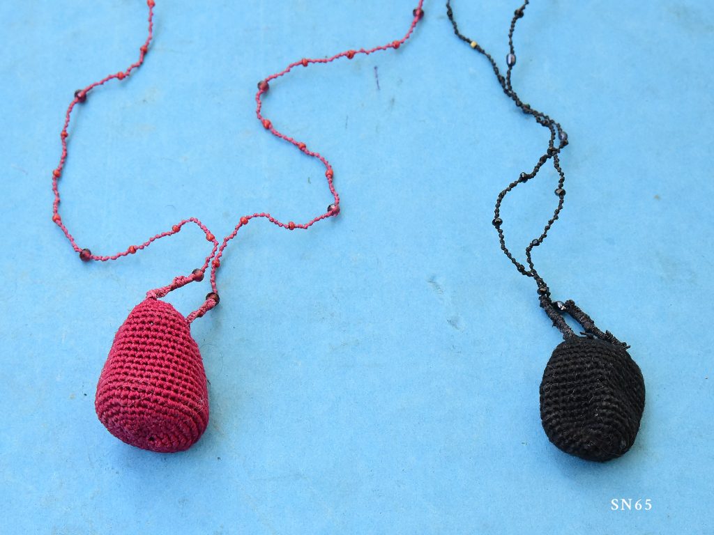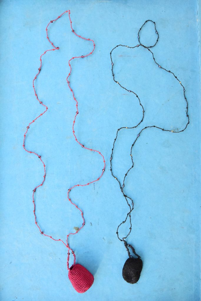 A delicate necklace crafted with Venetian micro beads, finished with a knitted basket.