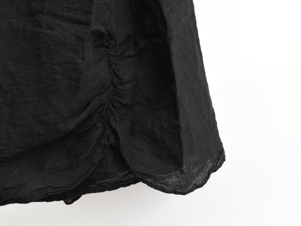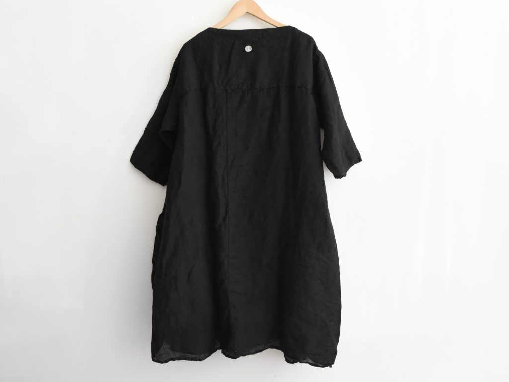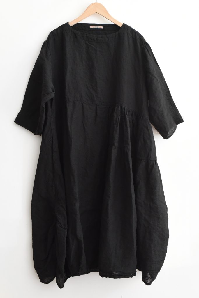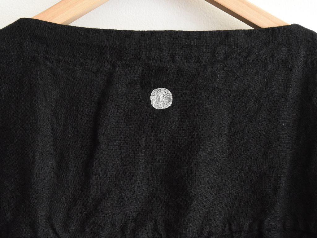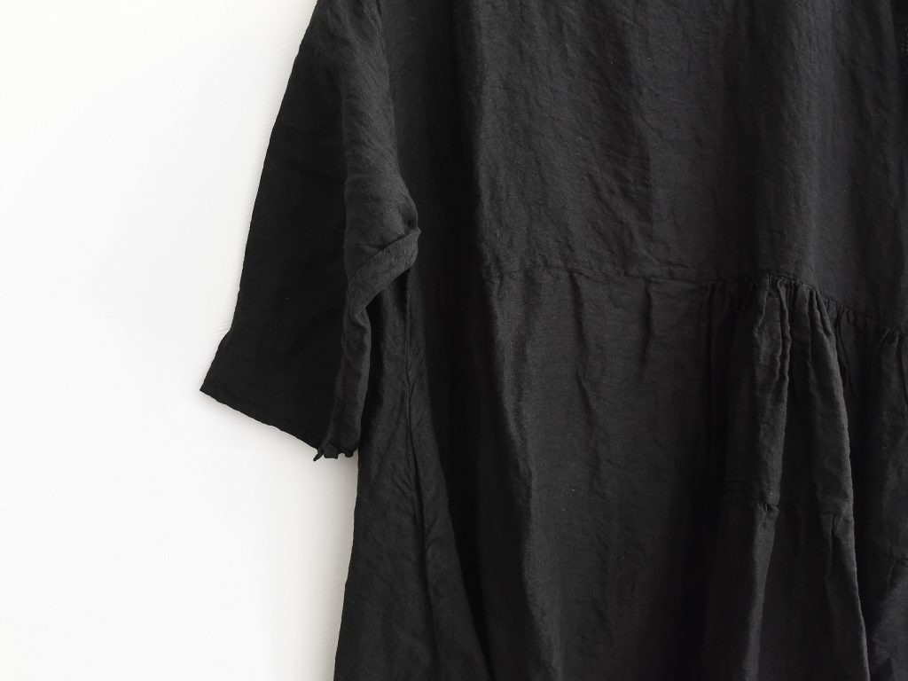 This All Spice Dress is made from 100% linen in a deep black tone. The relaxed silhouette features an asymmetrical pleated panel on the left side of the body, while the opposite side remains clean and straight, creating a quiet sculptural balance. Smock-inspired detailing at both sides of the hem adds subtle volume and movement. Finished with two side pockets, a wide boat neckline, and softly gathered sleeves. At the back of the dress, just below the neckline, a small circular embroidered motif adds a subtle handcrafted detail.