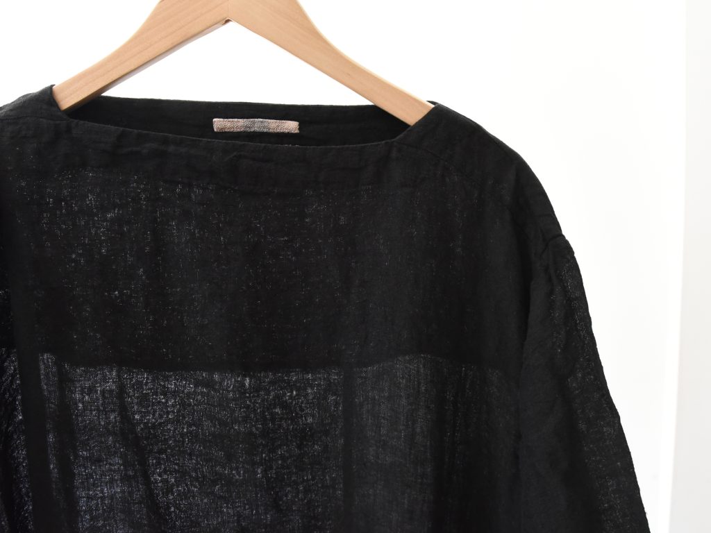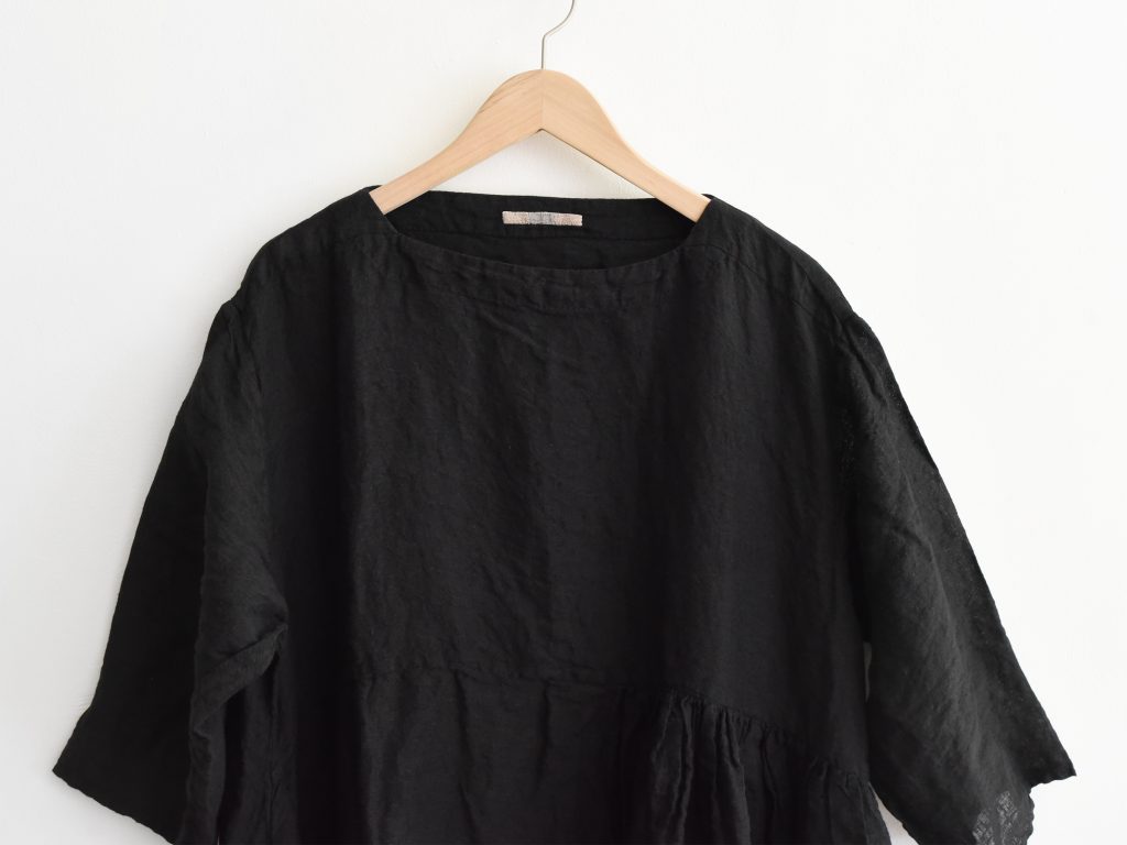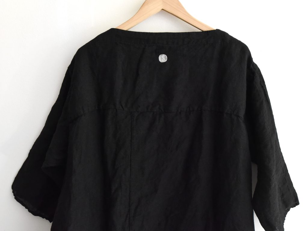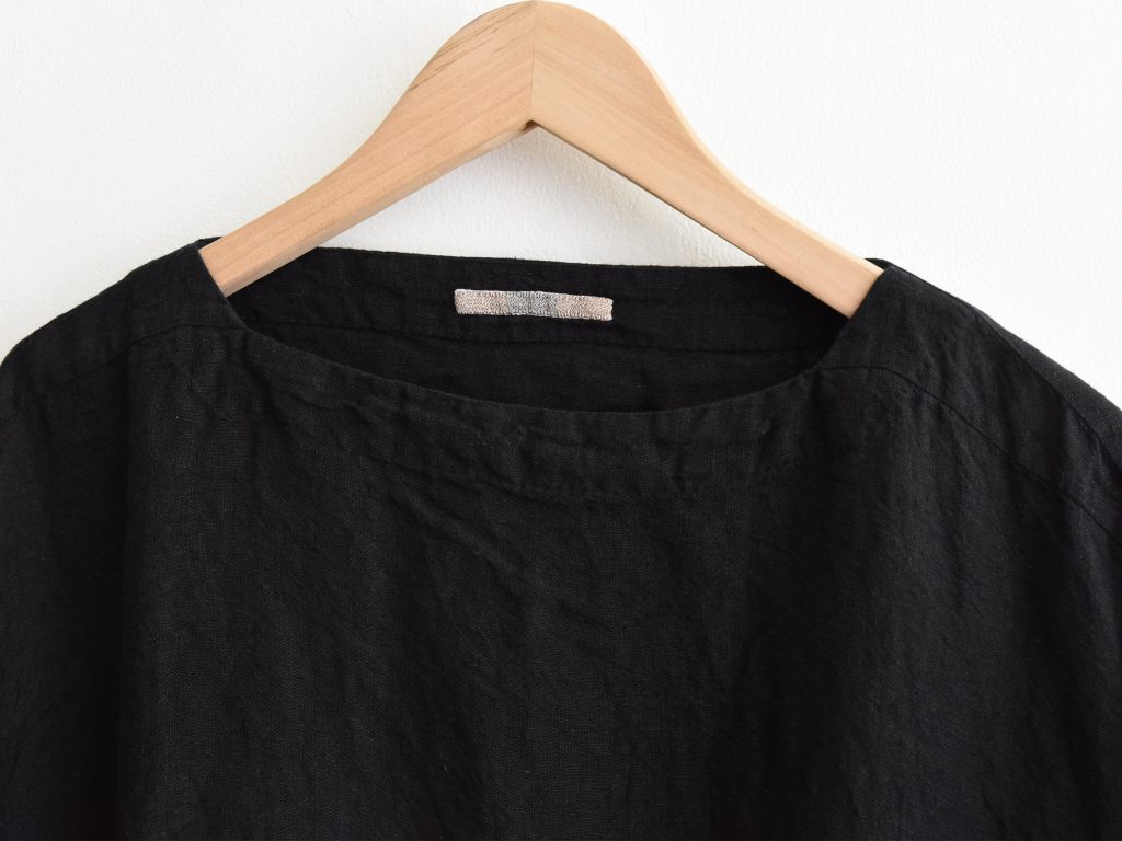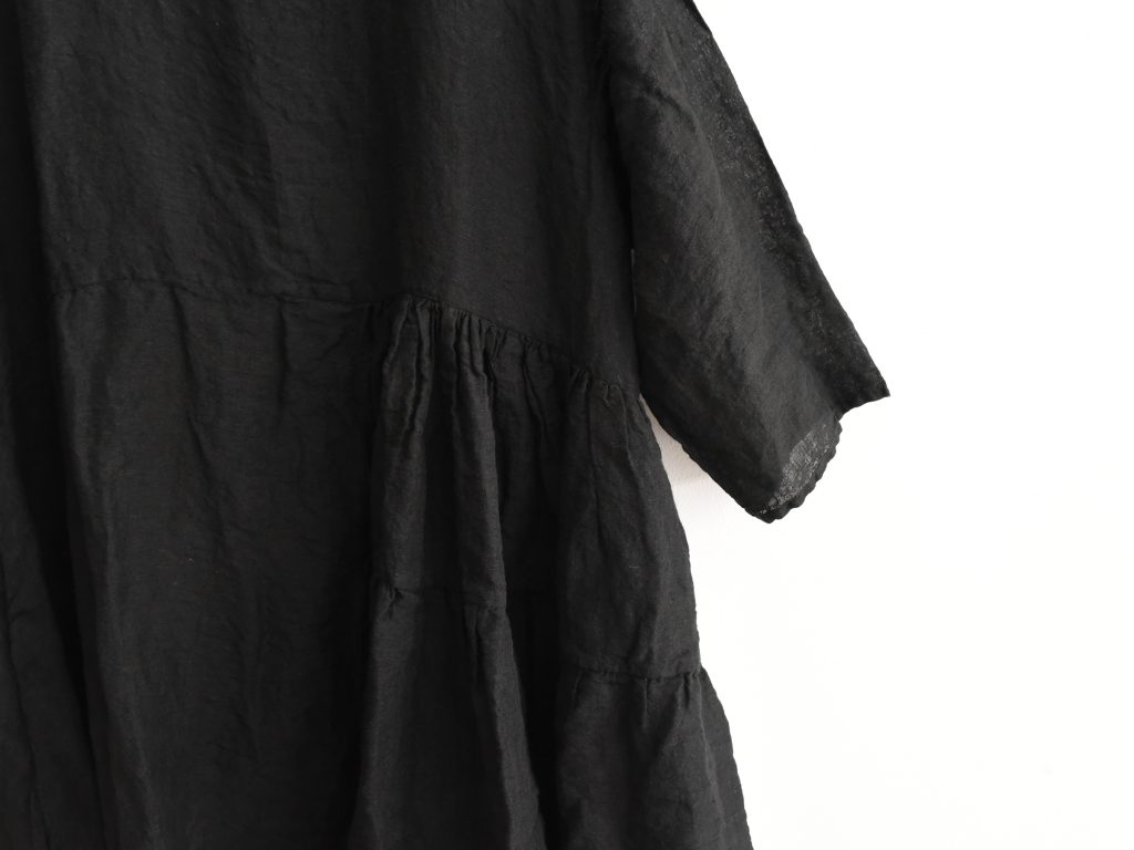 This All Spice Dress is made from 100% linen in a deep black tone. The relaxed silhouette features an asymmetrical pleated panel on the left side of the body, while the opposite side remains clean and straight, creating a quiet sculptural balance. Smock-inspired detailing at both sides of the hem adds subtle volume and movement. Finished with two side pockets, a wide boat neckline, and softly gathered sleeves. At the back of the dress, just below the neckline, a small circular embroidered motif adds a subtle handcrafted detail.