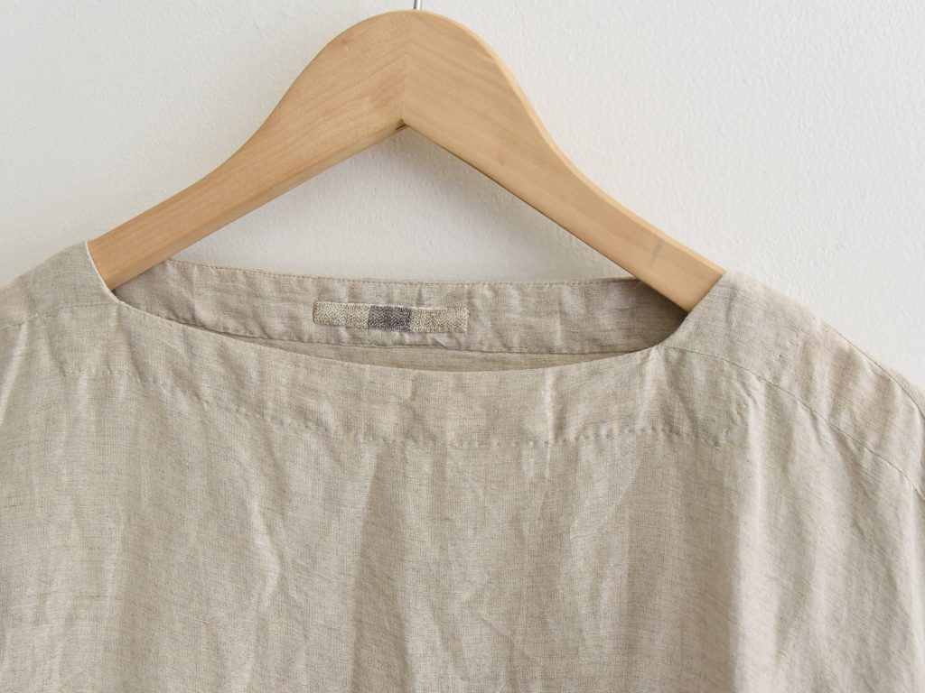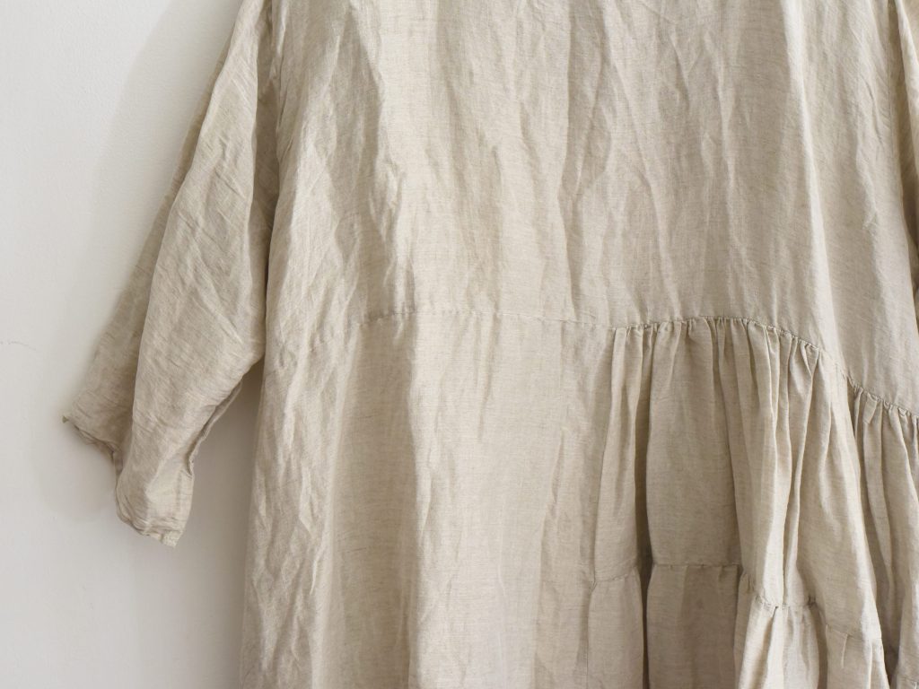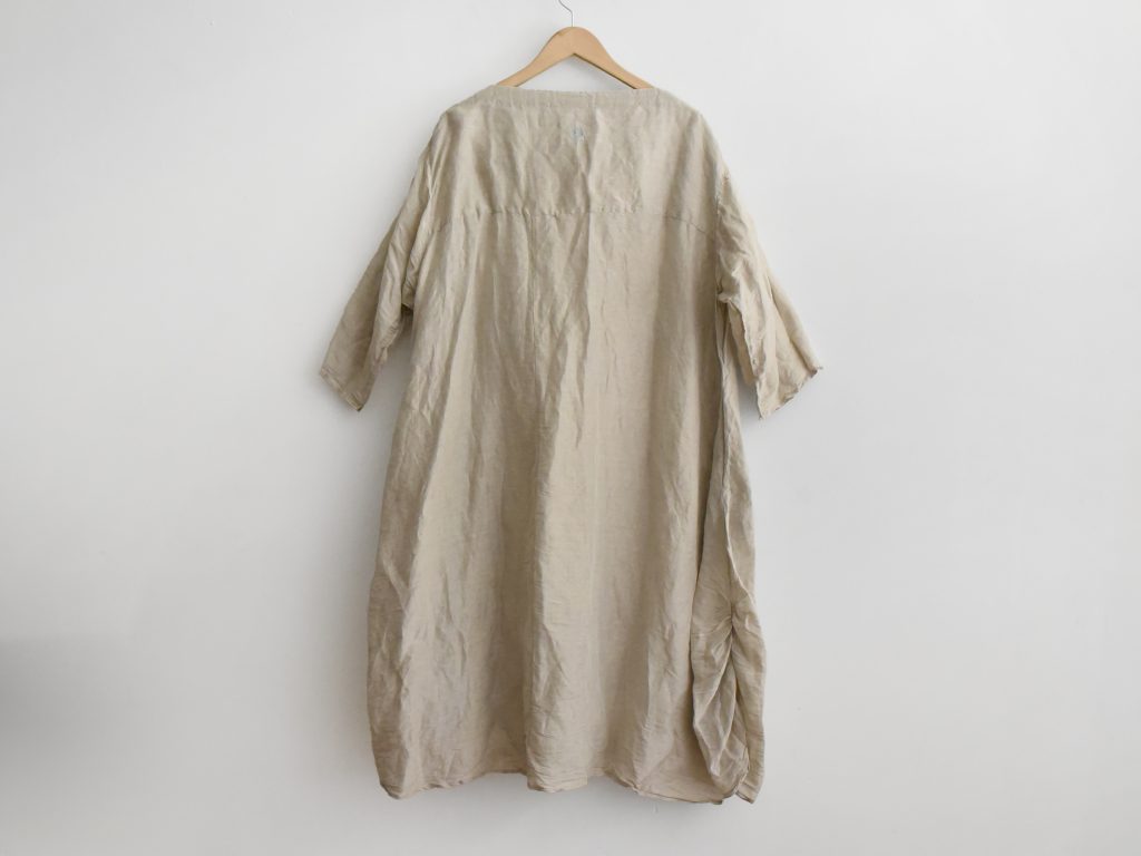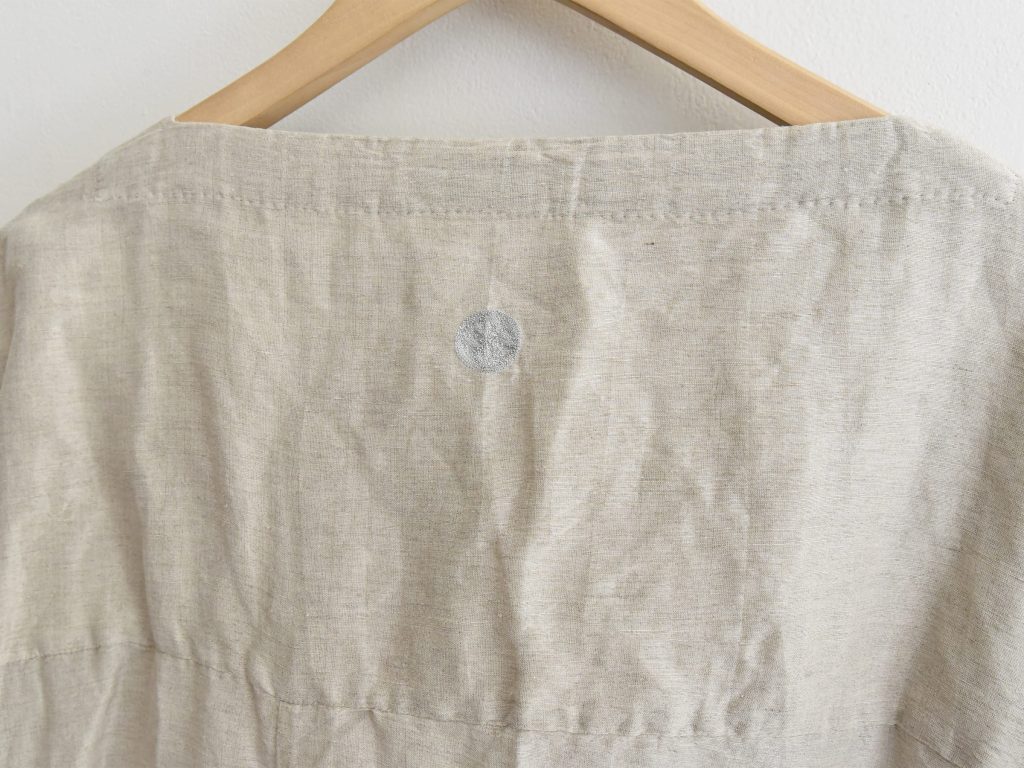 This All Spice Dress is made from a soft 50% silk and 50% linen blend in a warm natural beige tone. The relaxed silhouette features an asymmetrical pleated panel on the left side of the body, while the opposite side remains clean and straight, creating a quiet sculptural balance. Smock-inspired detailing at both sides of the hem adds subtle volume and movement. Finished with two side pockets, a wide boat neckline, and softly gathered sleeves. At the back of the dress, just below the neckline, a small circular embroidered motif.