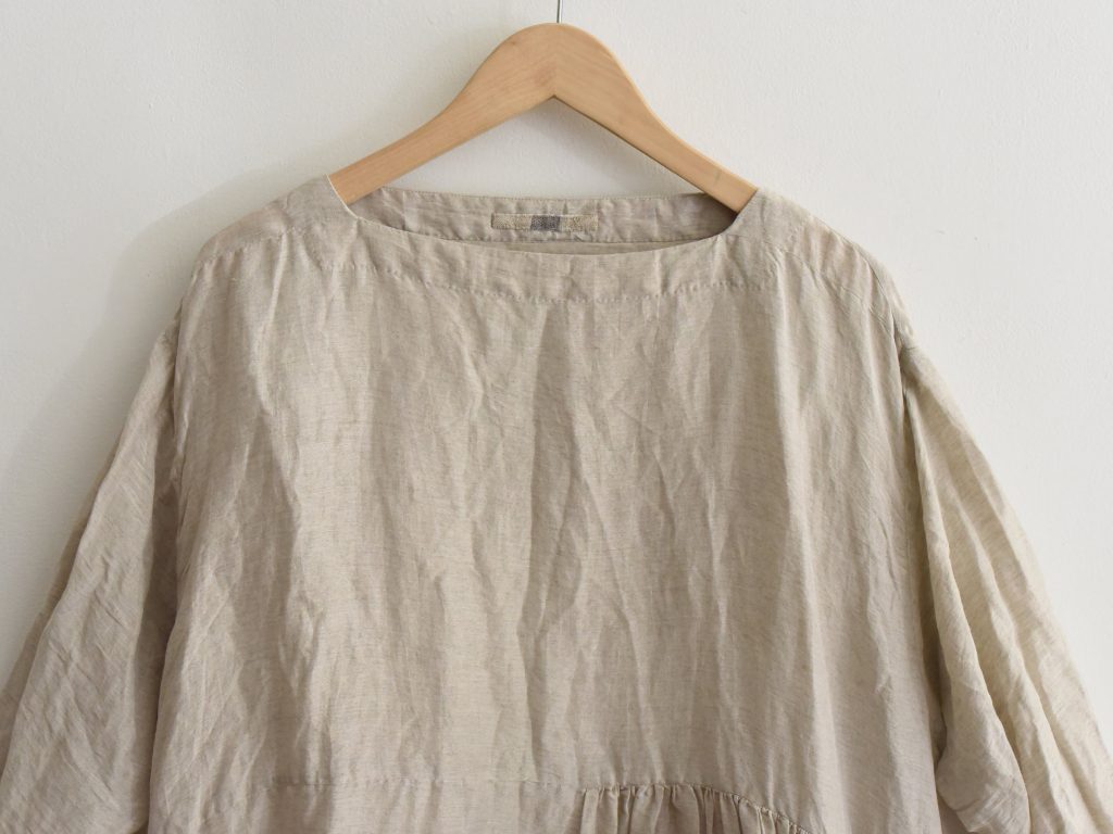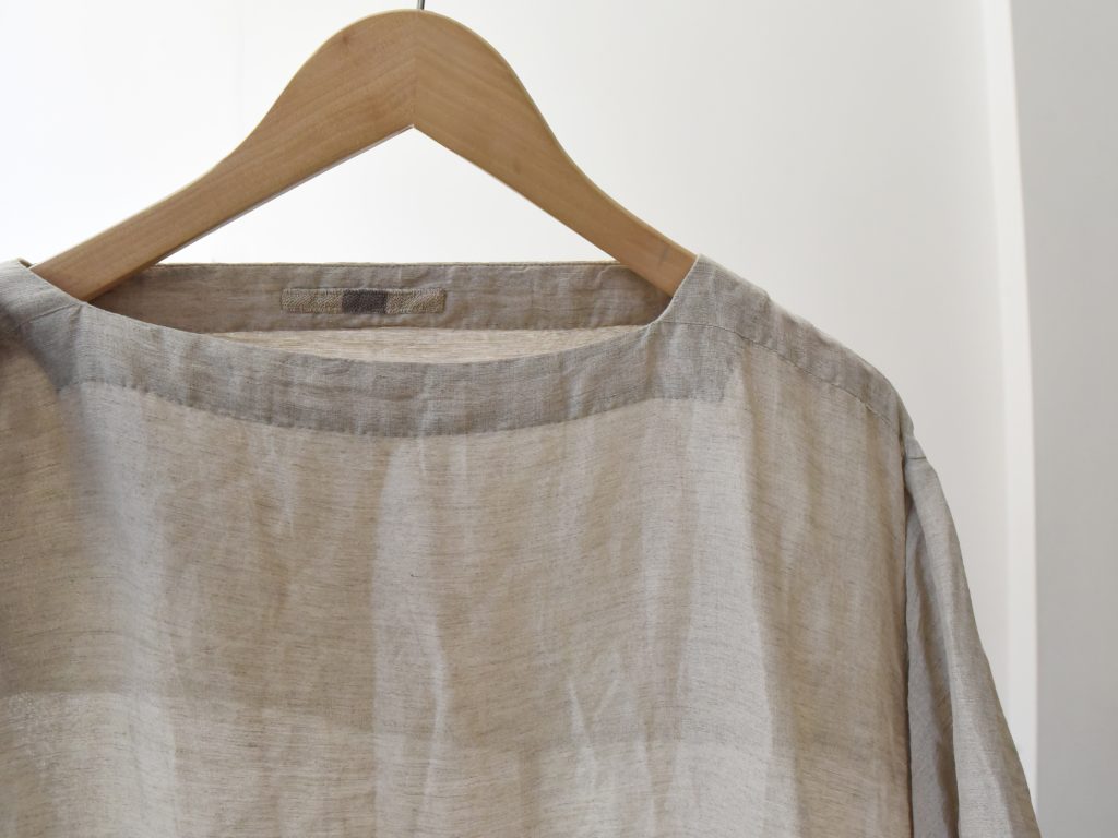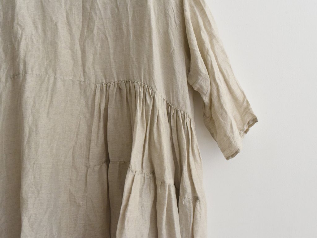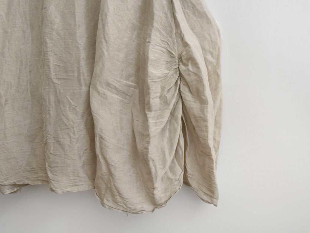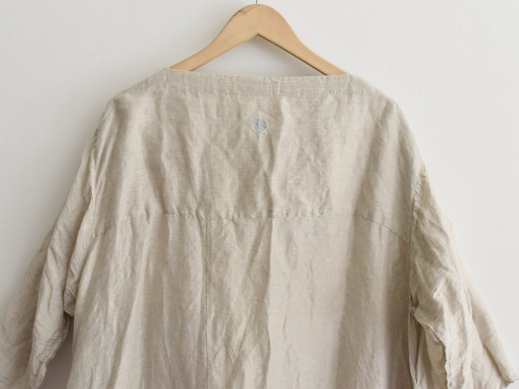 This All Spice Dress is made from a soft 50% silk and 50% linen blend in a warm natural beige tone. The relaxed silhouette features an asymmetrical pleated panel on the left side of the body, while the opposite side remains clean and straight, creating a quiet sculptural balance. Smock-inspired detailing at both sides of the hem adds subtle volume and movement. Finished with two side pockets, a wide boat neckline, and softly gathered sleeves. At the back of the dress, just below the neckline, a small circular embroidered motif.