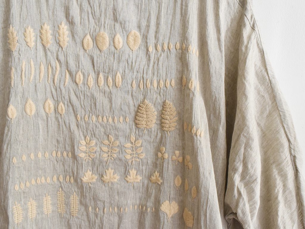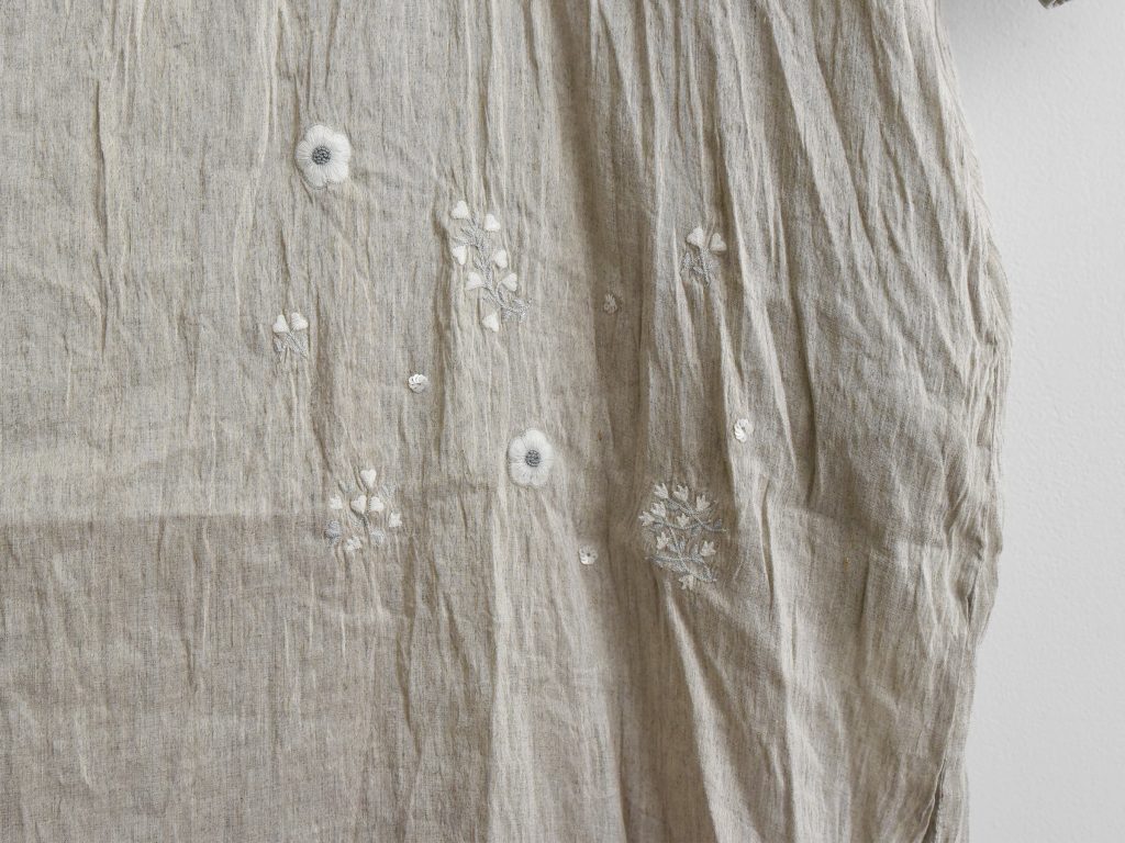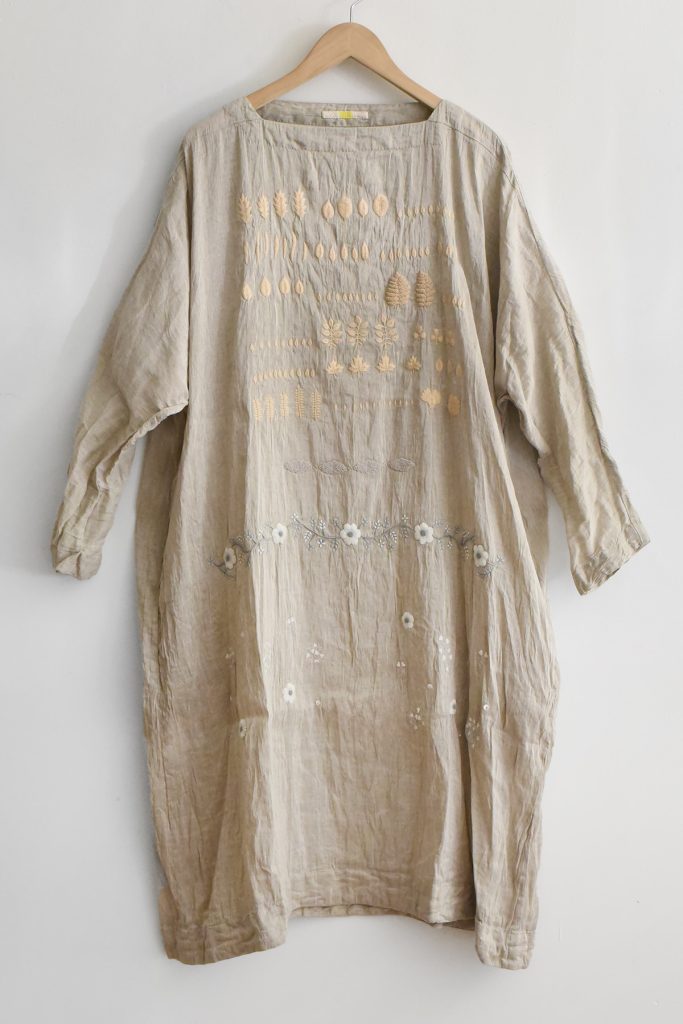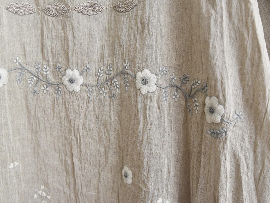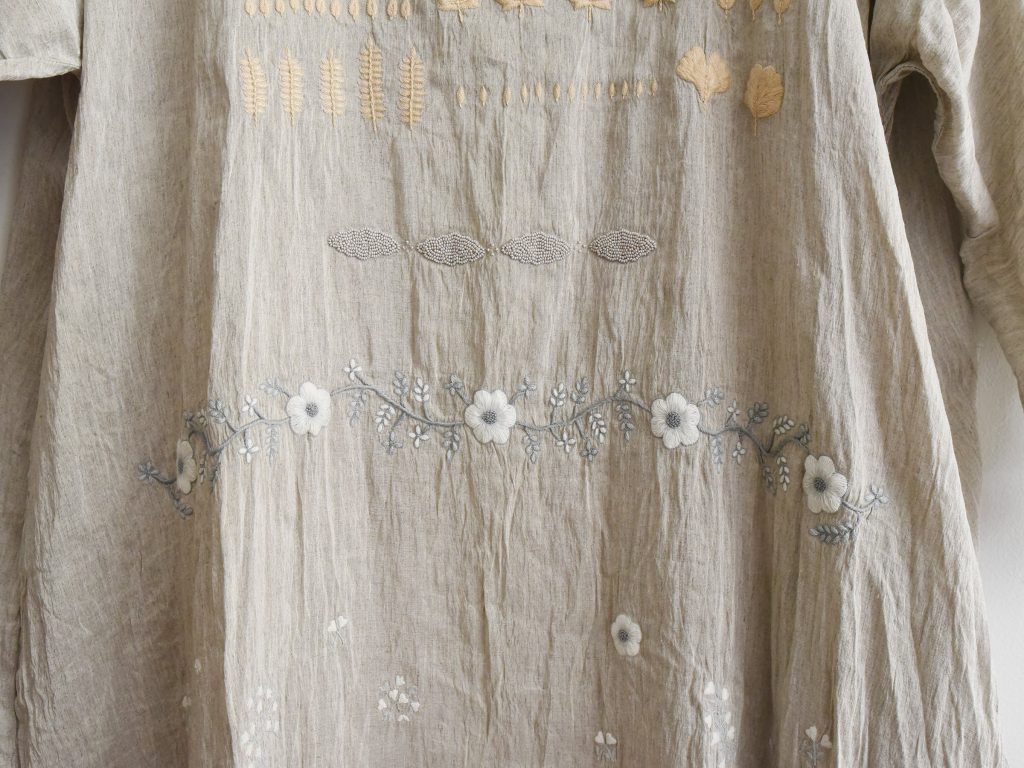 This Flower Dress is made from a soft silk and linen blend in a natural beige tone. The relaxed silhouette is finished with two side pockets and wide sleeves for an easy, comfortable fit. Across the front, delicate embroidery creates a layered composition of leaves, flowers, and botanical motifs in soft cream, grey, and white tones. Raised embroidery and fine stitched details give the dress rich texture and a handcrafted feel. The lower front is finished with a floral vine embroidery, while scattered small flowers continue across the body, creating a subtle garden-like pattern. The natural texture of the silk-linen fabric enhances the softness and depth of the embroidery.