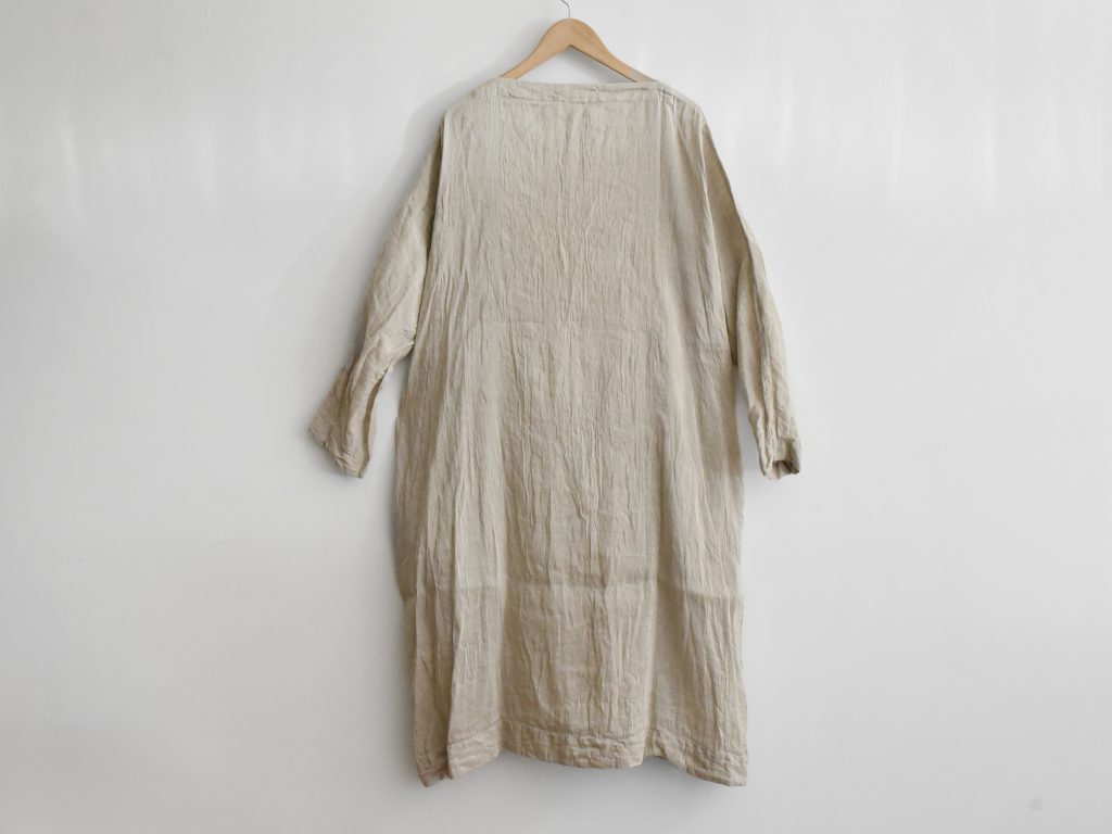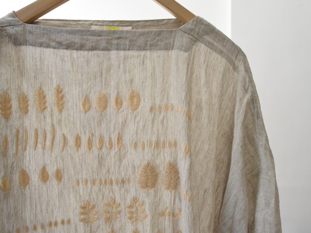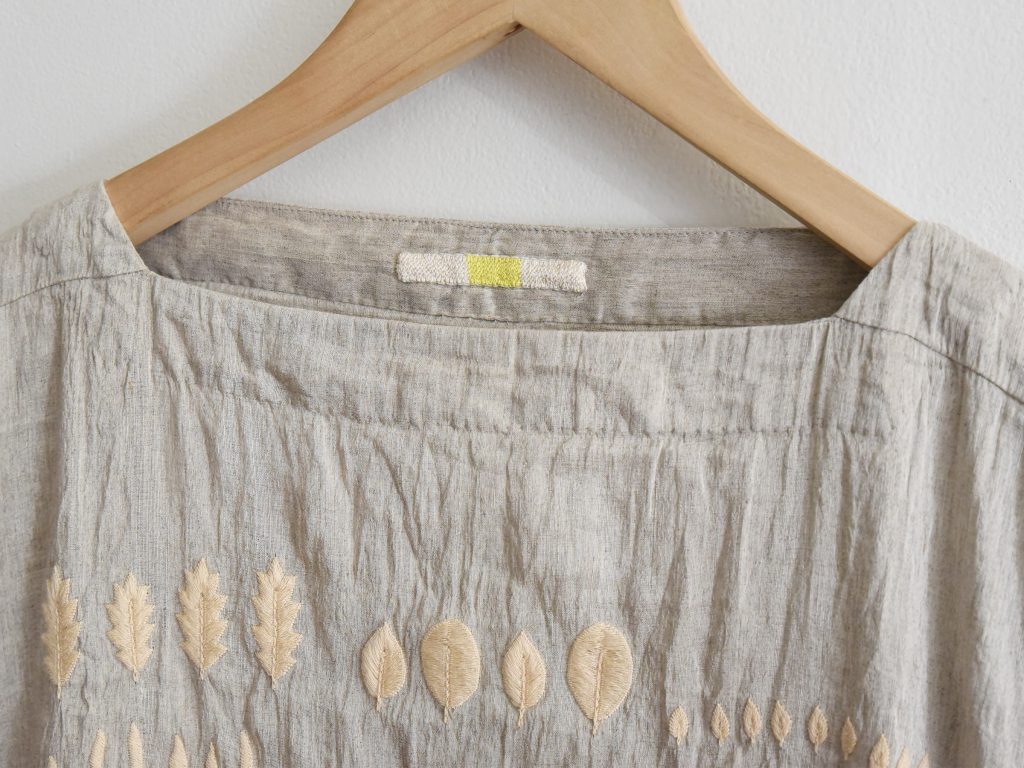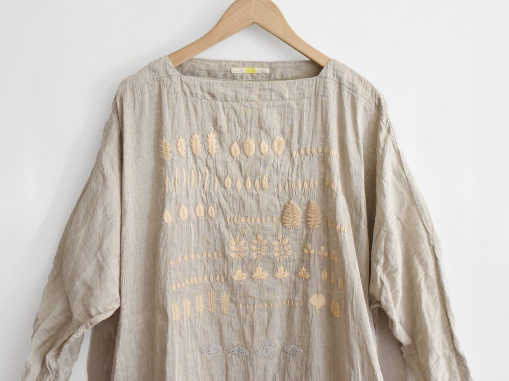 This Flower Dress is made from a soft silk and linen blend in a natural beige tone. The relaxed silhouette is finished with two side pockets and wide sleeves for an easy, comfortable fit. Across the front, delicate embroidery creates a layered composition of leaves, flowers, and botanical motifs in soft cream, grey, and white tones. Raised embroidery and fine stitched details give the dress rich texture and a handcrafted feel. The lower front is finished with a floral vine embroidery, while scattered small flowers continue across the body, creating a subtle garden-like pattern. The natural texture of the silk-linen fabric enhances the softness and depth of the embroidery.