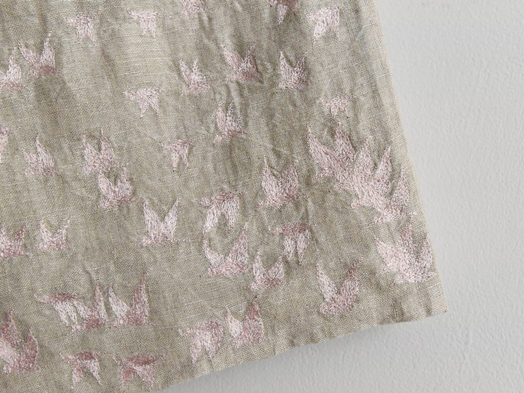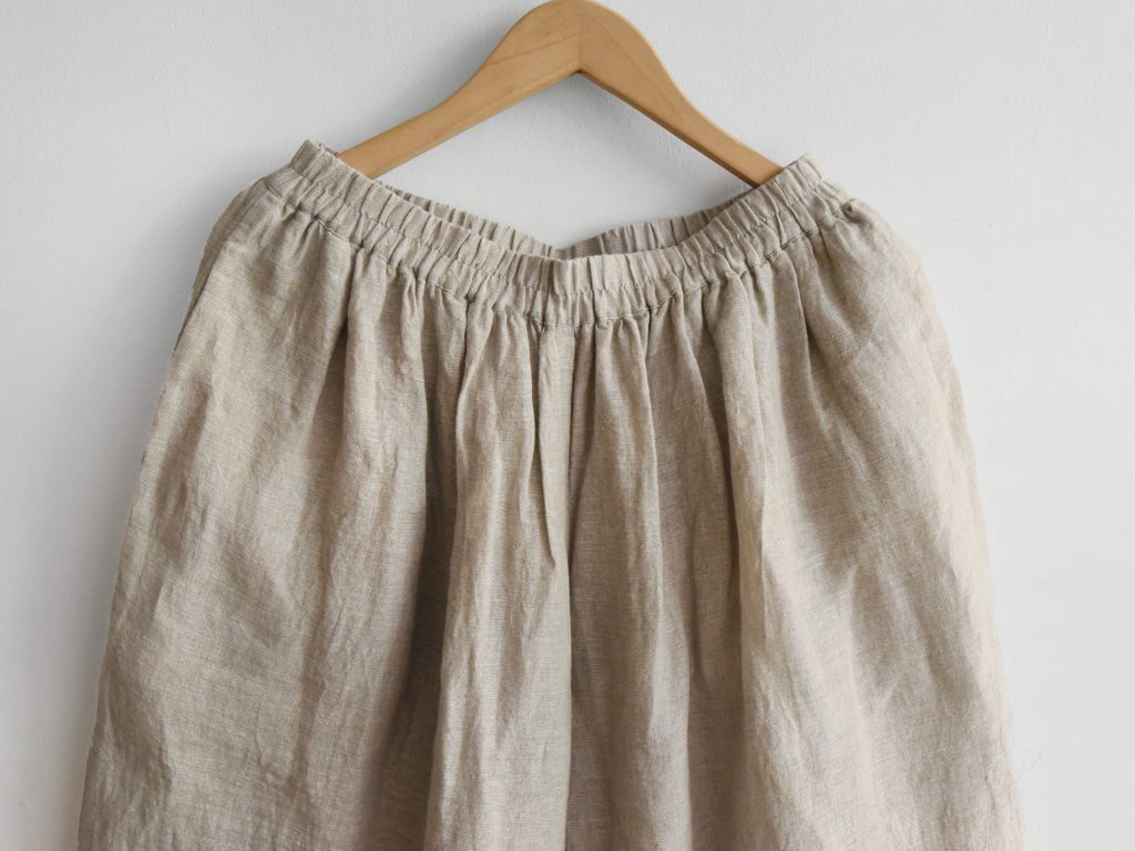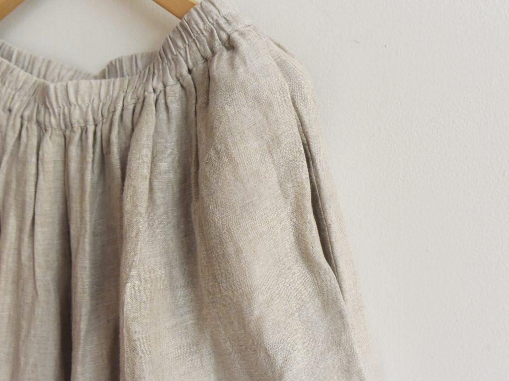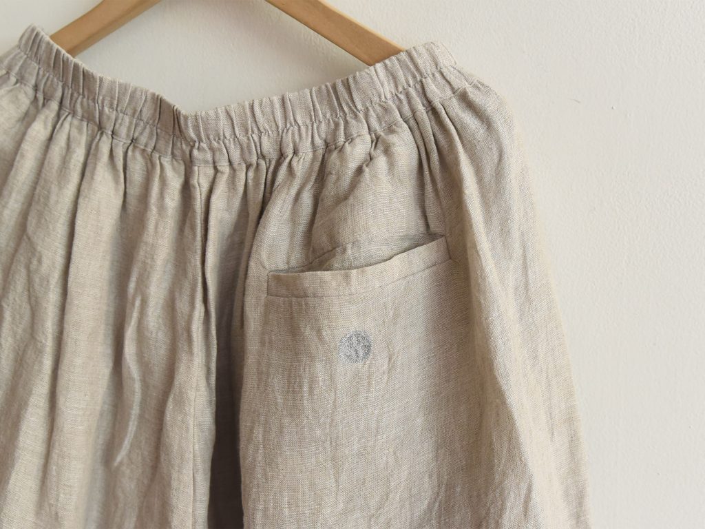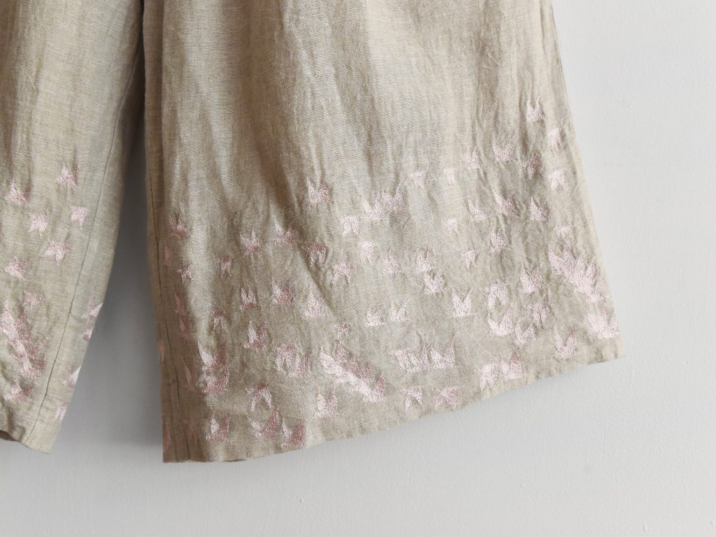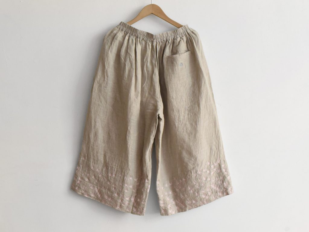 Women’s pants in natural color. Made from 100% linen. Designed with an elastic waistband. Features two side pockets and one back pocket. The back pocket is finished with a circular embroidery detail. Embroidery is applied at the hem. Wide leg silhouette with a wide hem.
