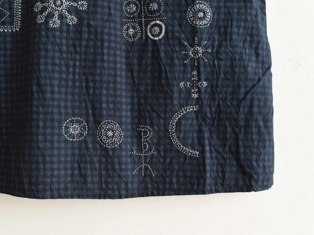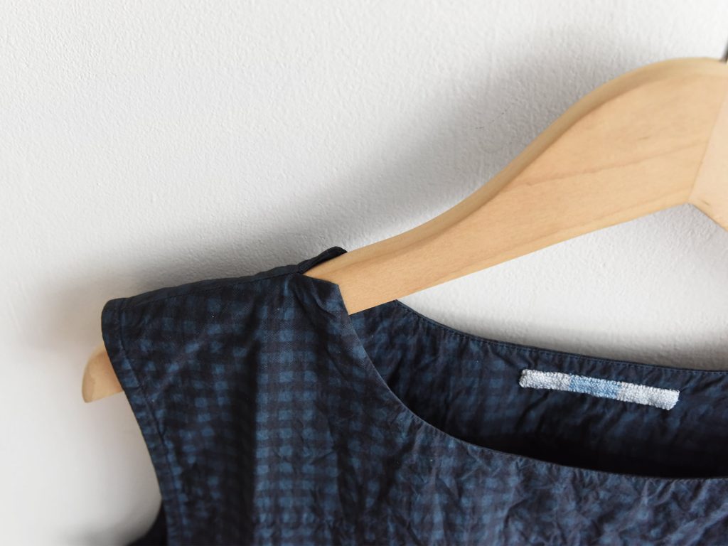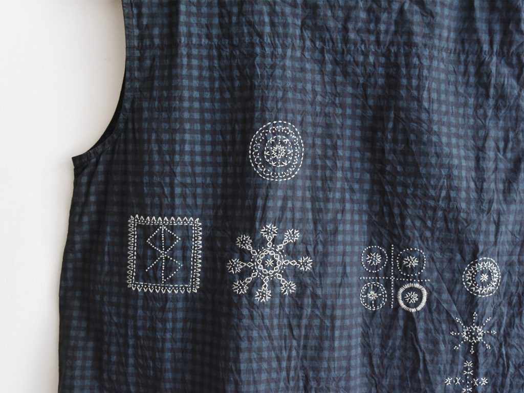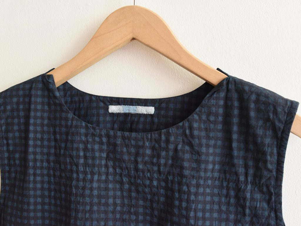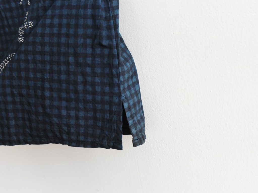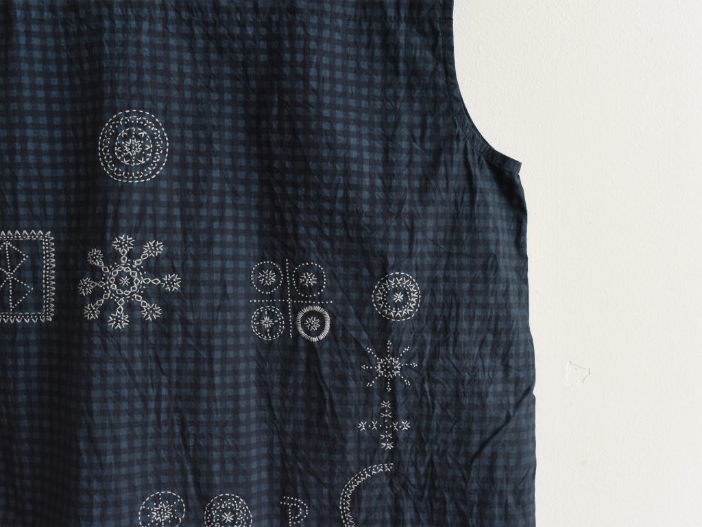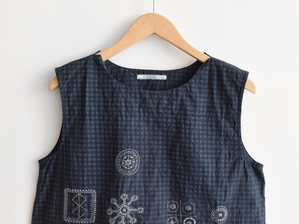 Women’s sleeveless blouse in a navy check pattern. Made from 100% cotton with a lightweight texture. Designed with a round neckline and sleeveless construction. Features embroidered motifs across the front. Slits at the shoulders and side hem. Straight silhouette with a clean hem.