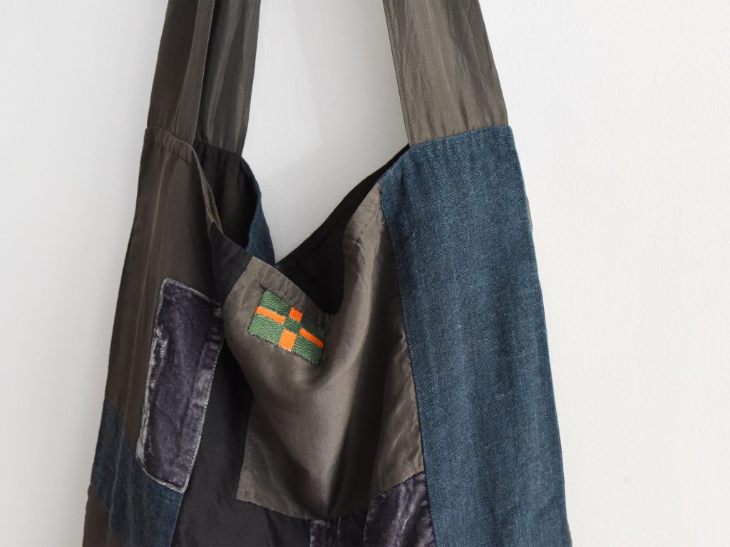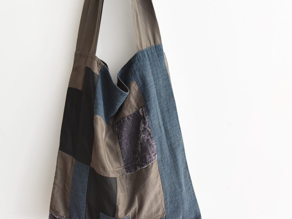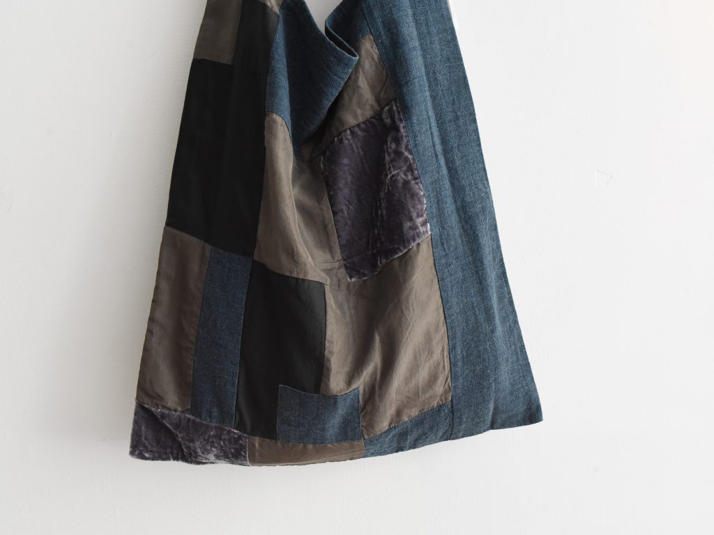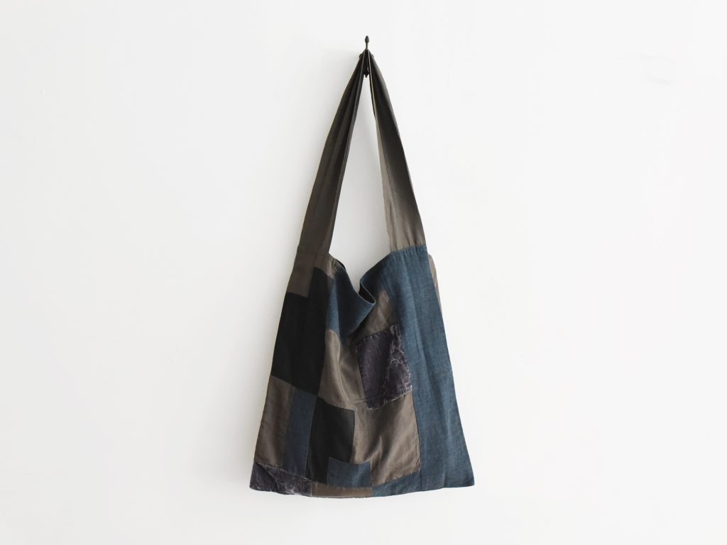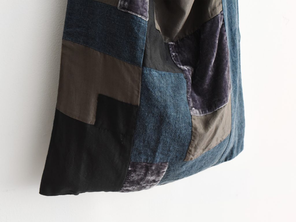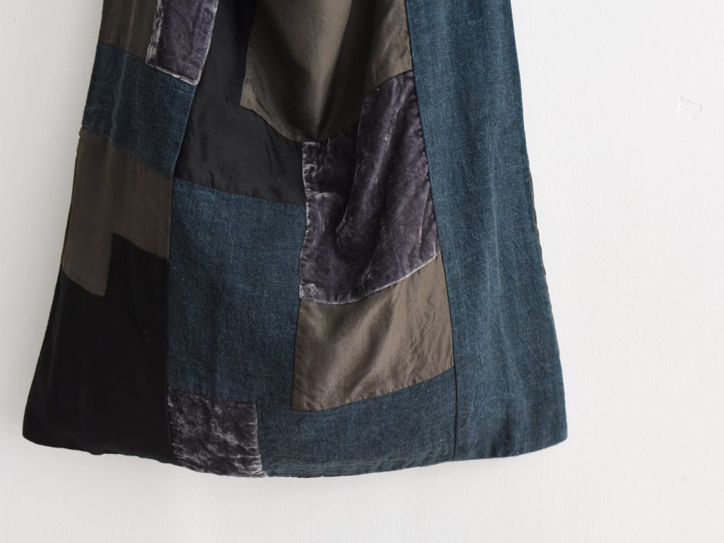 This patchwork shoulder bag is made from a mix of silk, cotton, and linen in the Aodress sumi colorway. Deep charcoal, black, indigo, and muted grey panels are pieced together to create an abstract patchwork design with rich tonal contrast. Different fabric textures, including linen, soft cotton, lightly lustrous silk, and velvet-like panels, give the bag depth and a handmade character..