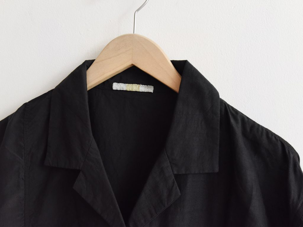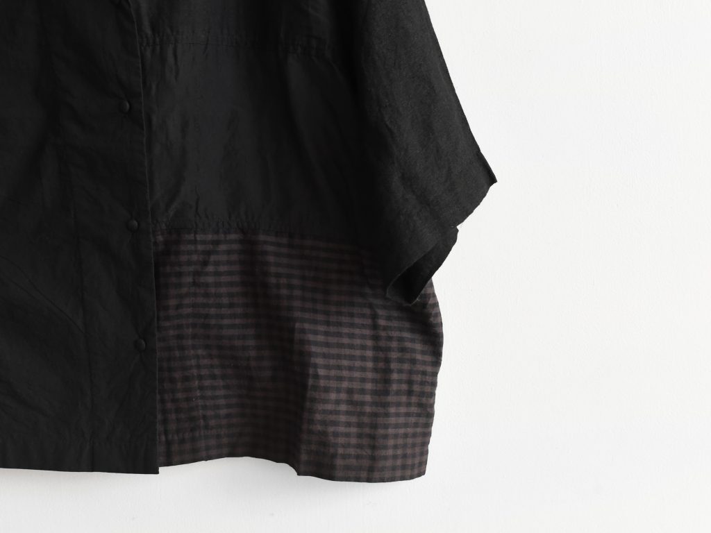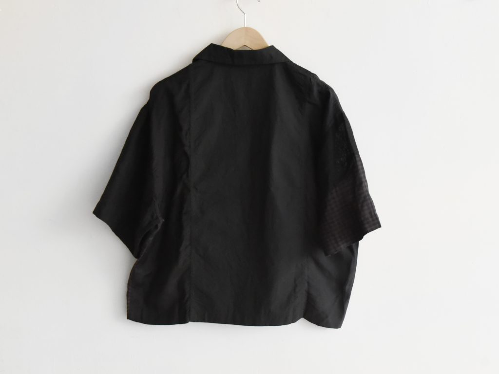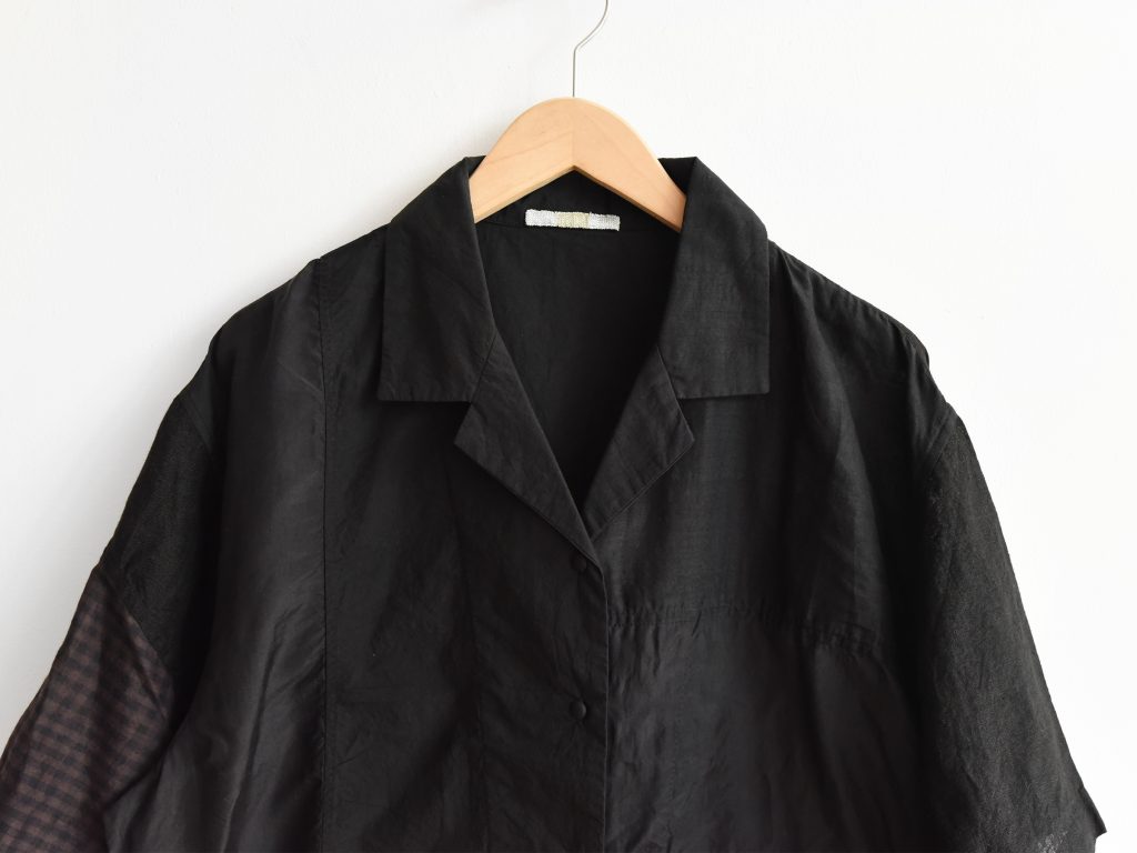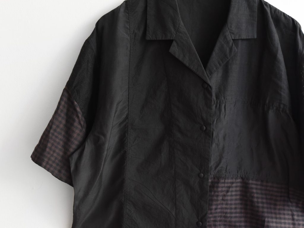 Women’s open collar shirt in black mixed fabrics. Made from cotton, linen, and silk. Constructed with multiple fabric panels in different colors and patterns. Light weight. Designed with an open collar and front button closure. Short sleeves.