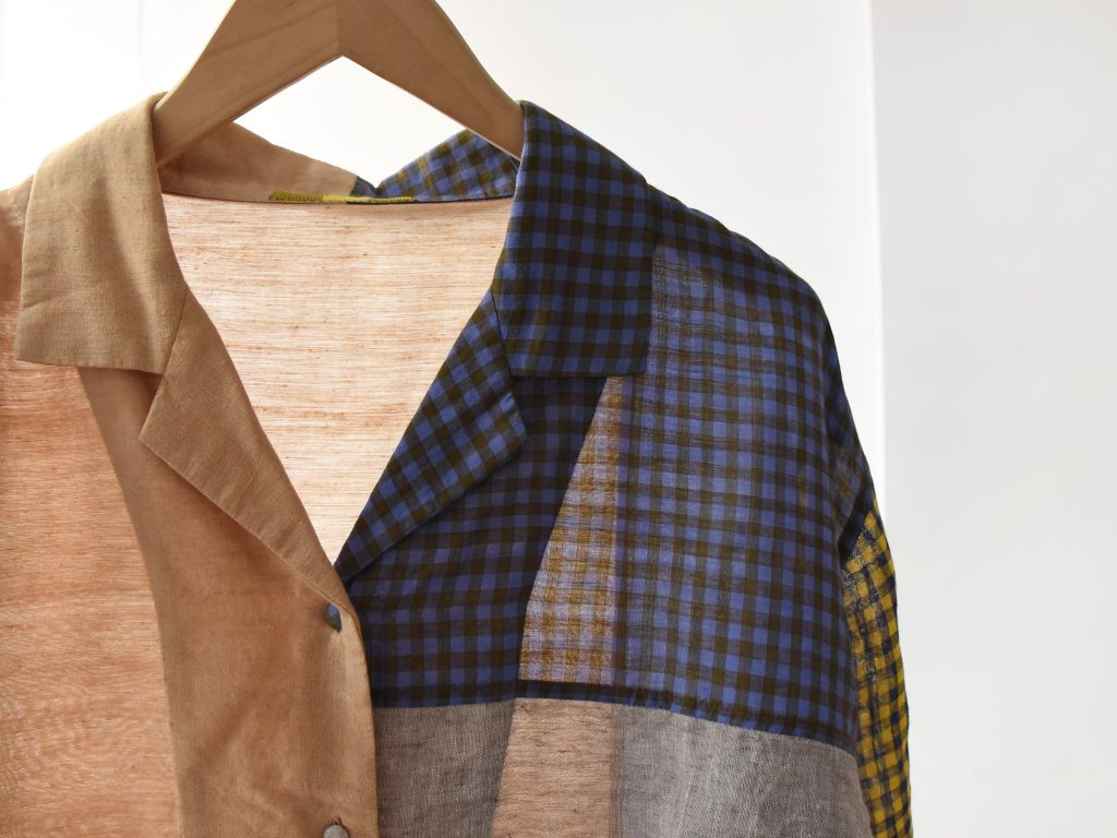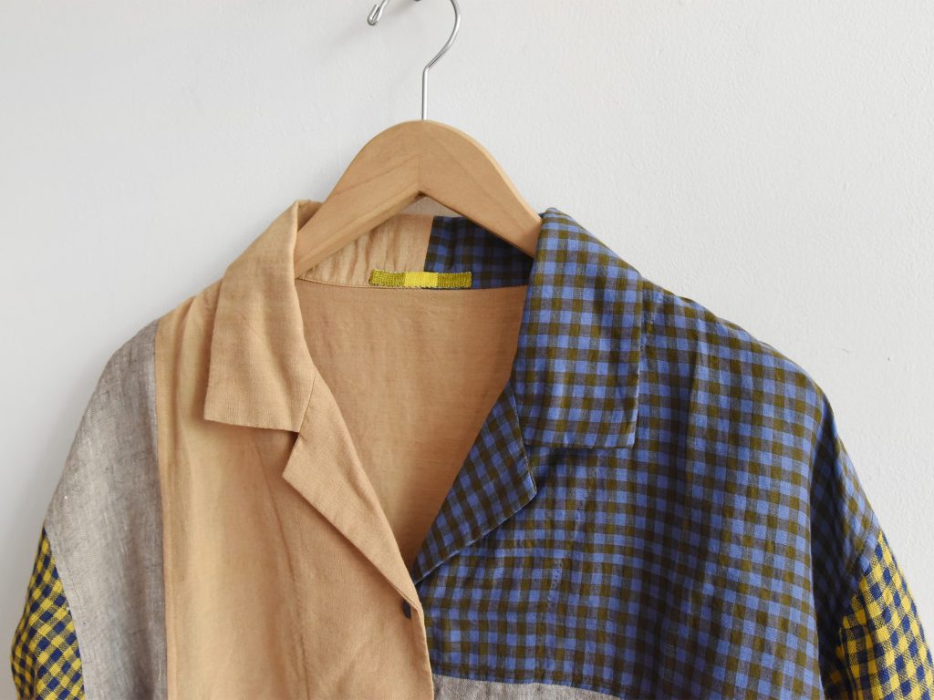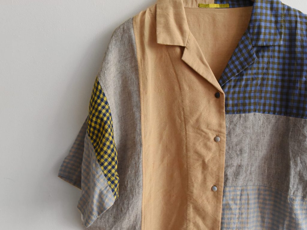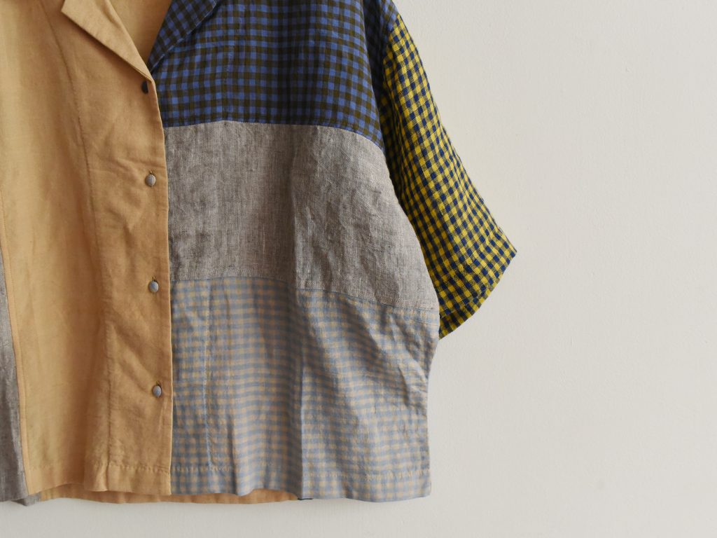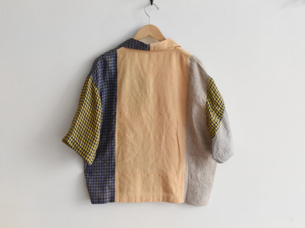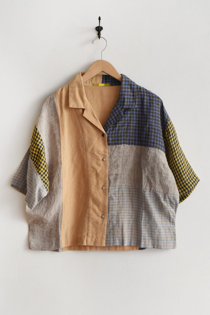 Women’s open collar shirt in mixed fabrics. Made from cotton, linen, and silk. Constructed with multiple fabric panels in different colors and patterns. Light weight. Designed with an open collar and front button closure. Short sleeves.