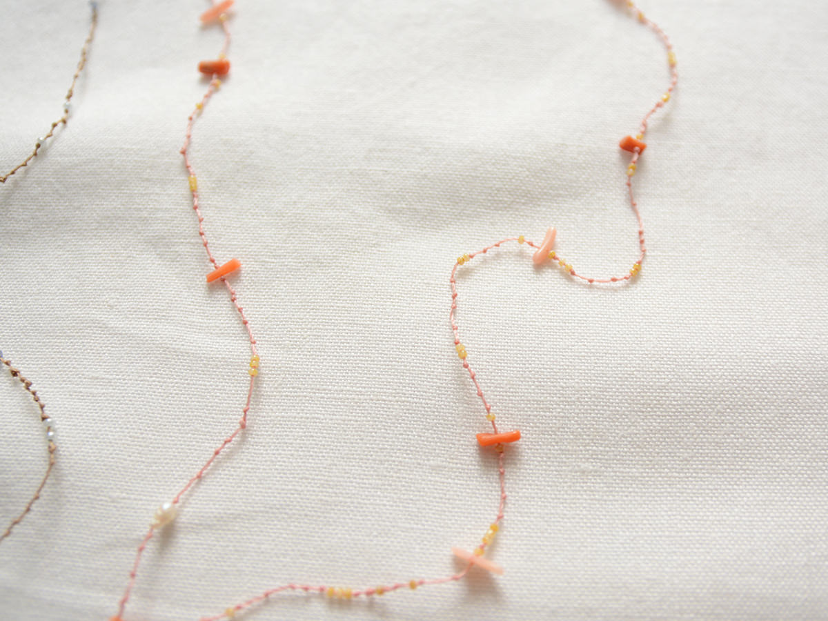 Handwoven necklaces are made with silk, linen, rami fabrics and Venetian micro beads.