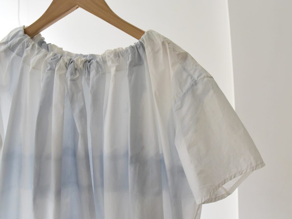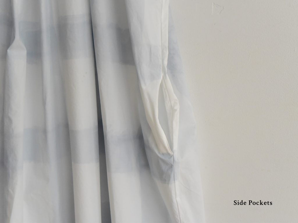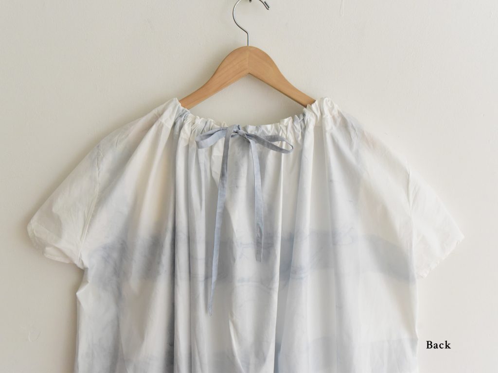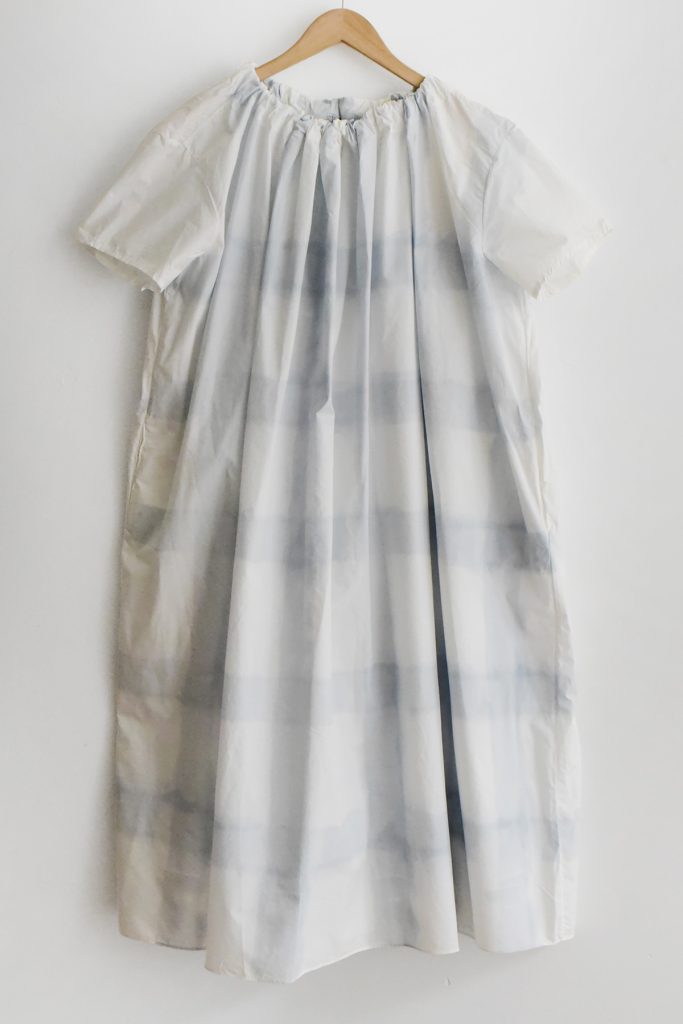 Atem botanical dye cotton dress made from lightweight natural cotton. The neckline is adjustable with a ribbon tie at the back, and the dress features two side pockets and a relaxed gathered silhouette. Each piece is uniquely dyed using botanical techniques.