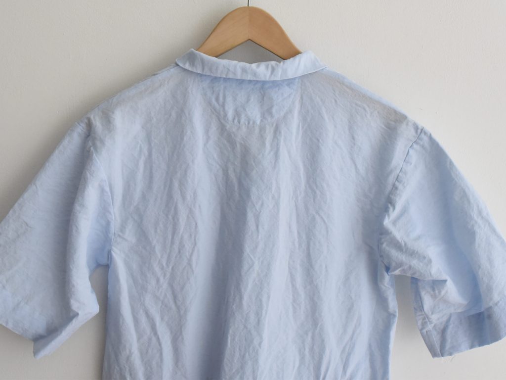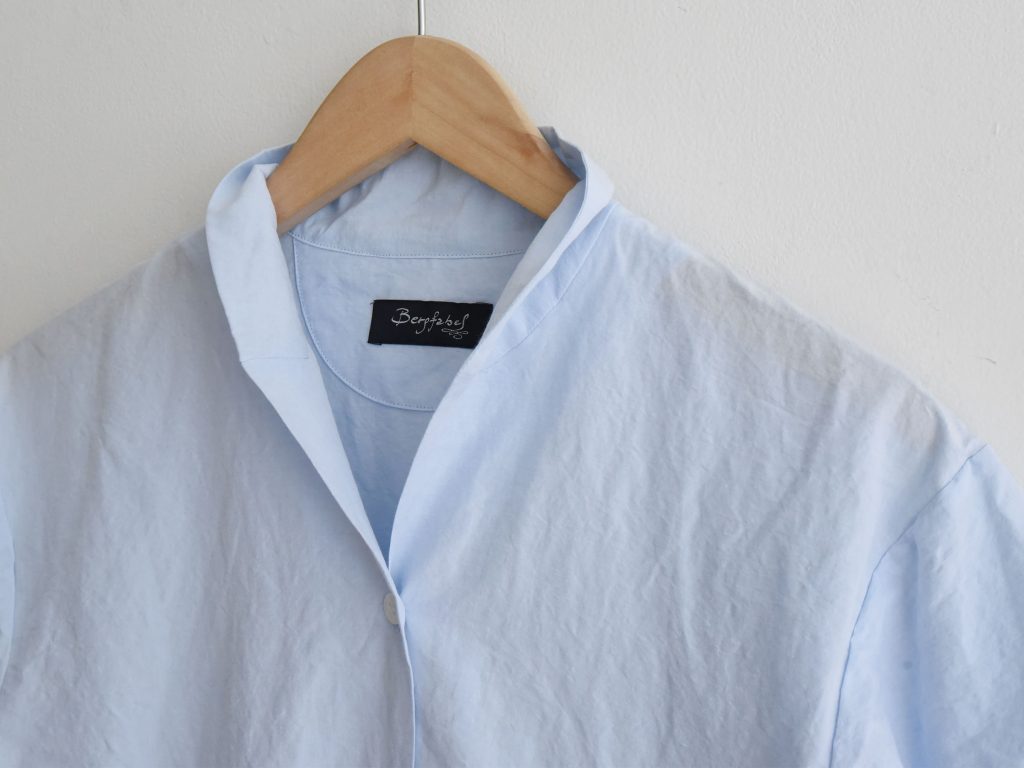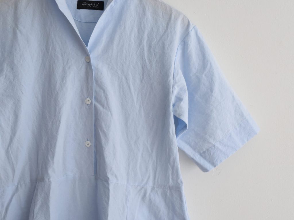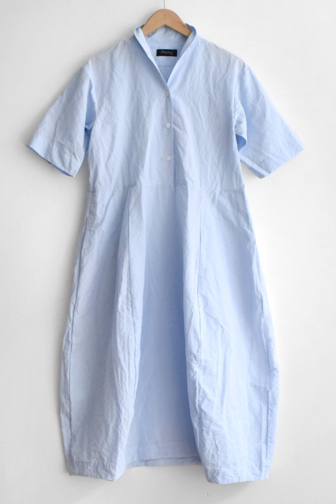 The Bergfabel Letty Dress is made in Italy from a breathable cotton and linen blend in a soft blue tone. Designed with a gently shaped silhouette, short sleeves, and a button front.