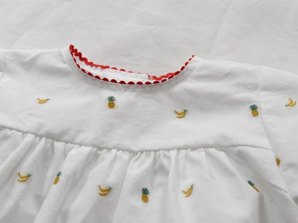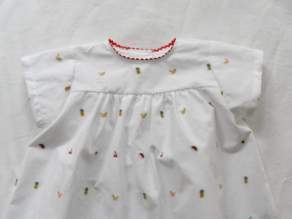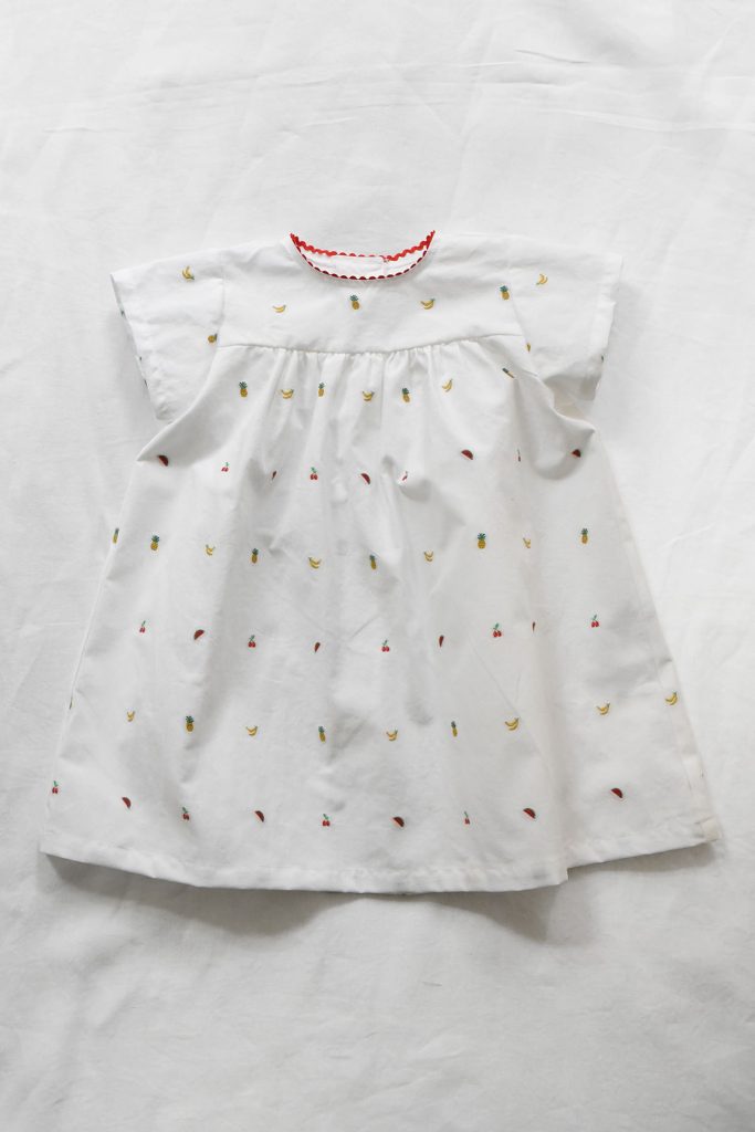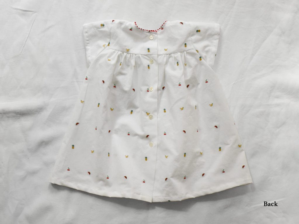 Italian fabric with delicately embroidered fruit motifs on a soft white base. Each fruit is individually stitched—not printed—creating a subtle texture and a refined, handcrafted feel. Finished with red ric rac trim along the neckline and a back button closure for easy dressing.
