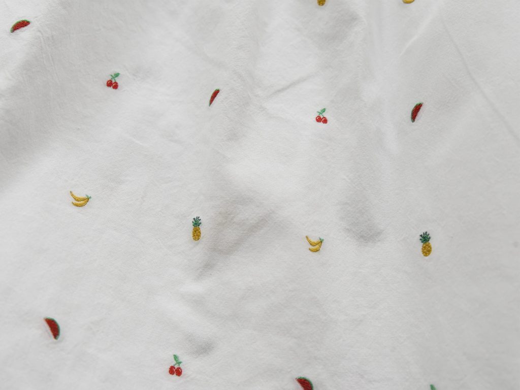 100% Cotton. Made in USA. Embroidered Fruits.