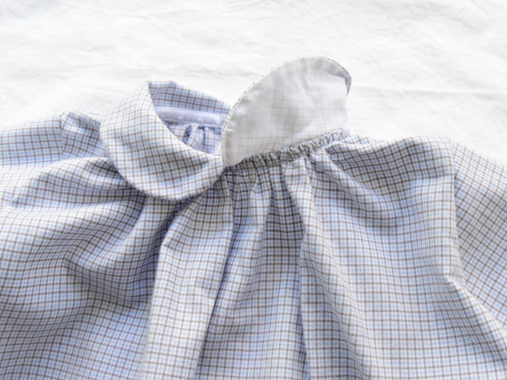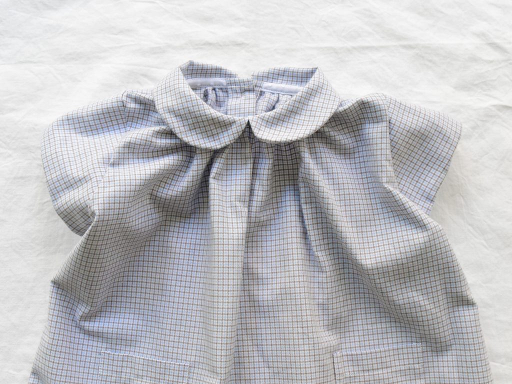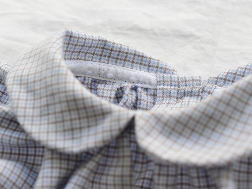 The collar piping is trimmed with white mesh with a dot pattern