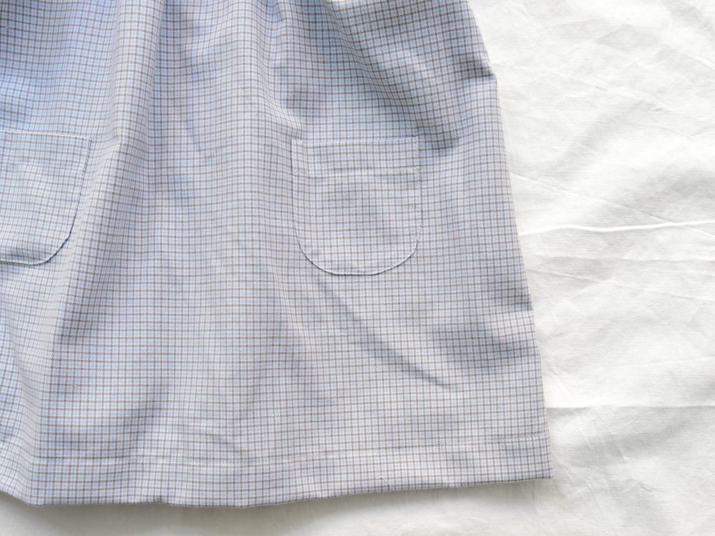 Two front pockets. Back button closure.