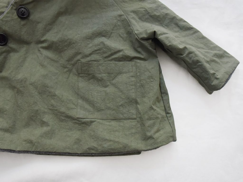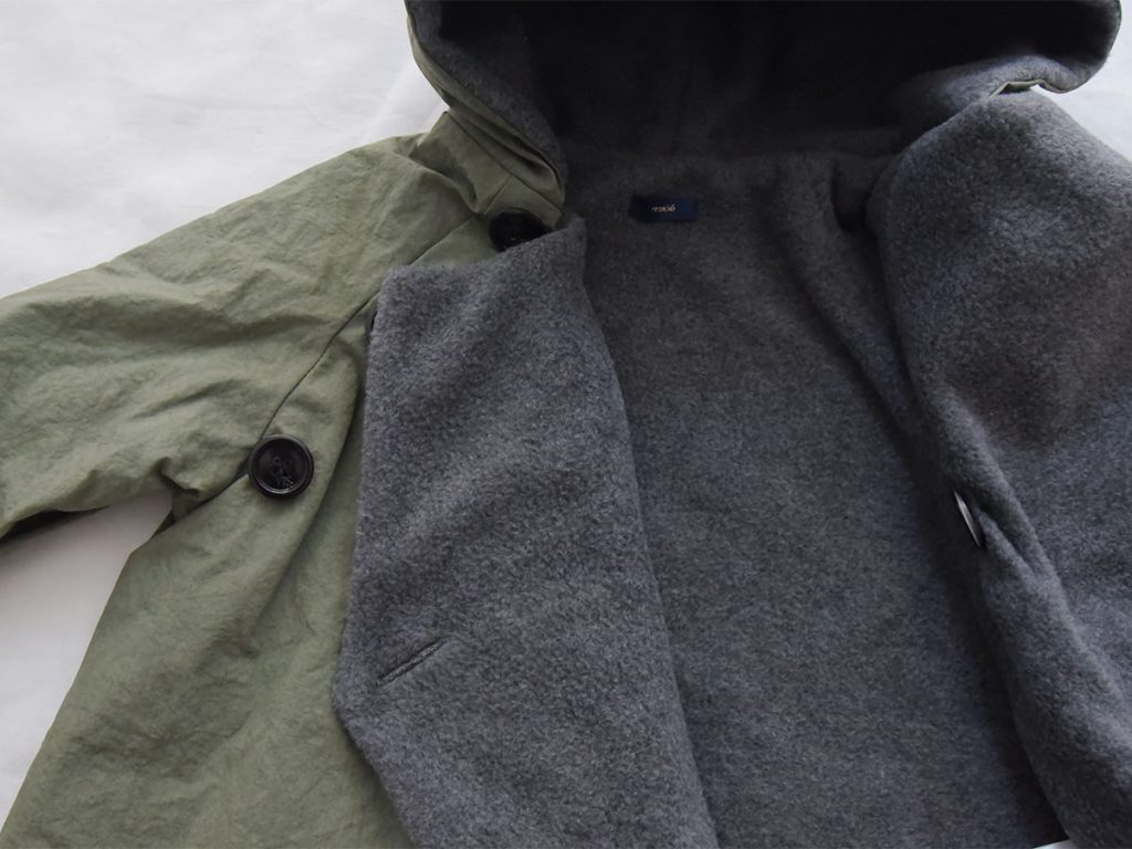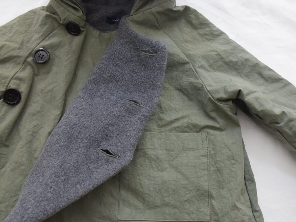 Since it is woven from high-density cotton, it has some water resistant (not waterproof/repellent). The lining is made of 100% polyester soft fleece. There are three buttons on the outside and one button on the inside, which helps keep the garment secure and prevents it from flapping even in cold weather.