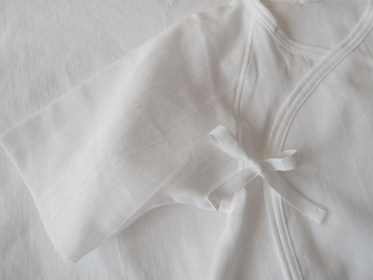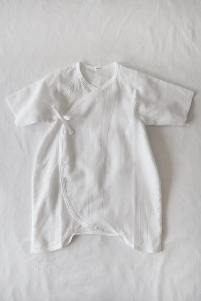 Simple and delicate Hadagi, a gender neutral kimono onesie for newborn to 6-month-old baby.