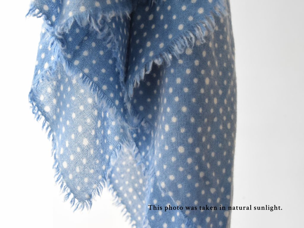 A beautifully soft washed cashmere scarf handmade in Nepal from high-grade cashmere. This  44″ x 44″ square scarf features a delicate small dot pattern and a lightweight, airy texture that drapes effortlessly. One of the photos was taken with the scarf held up to natural sunlight.