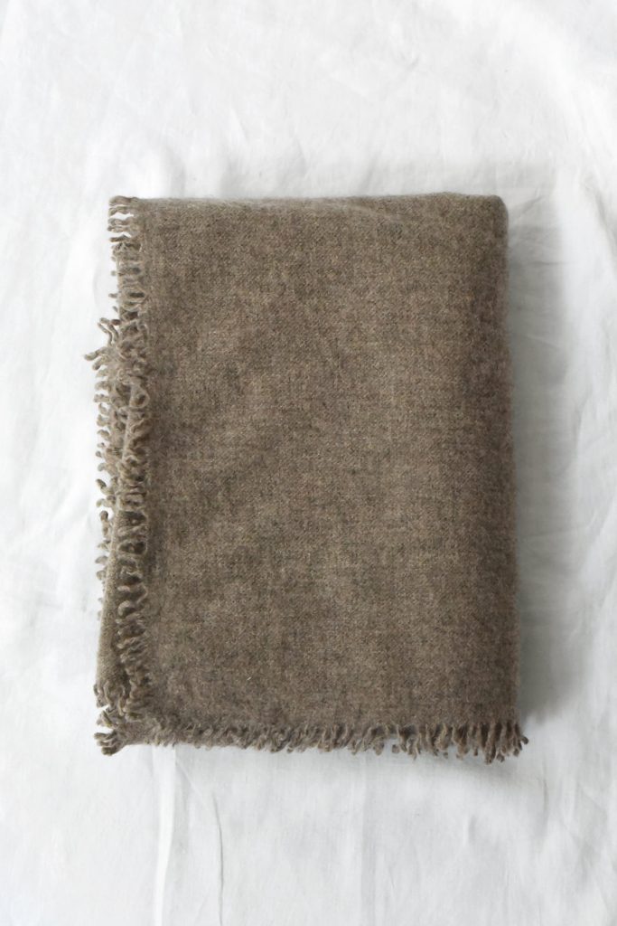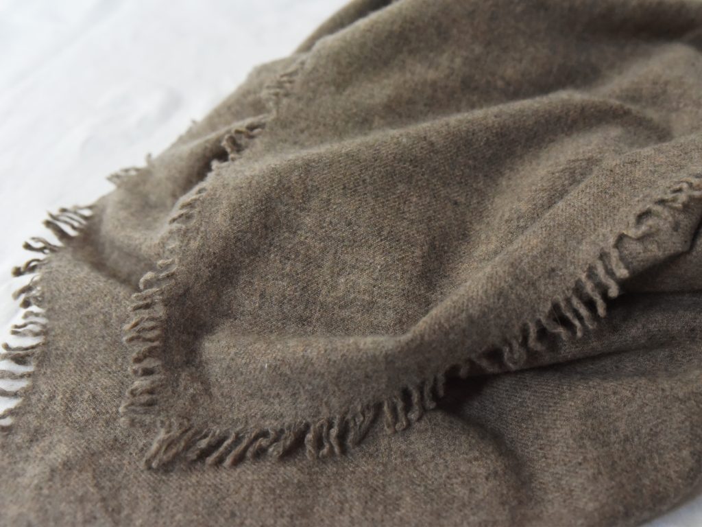 The fabric has a softly brushed surface with a dense, felted texture. Edges are finished with a subtle fringe. Designed in a large format, allowing use as a scarf or wrap.