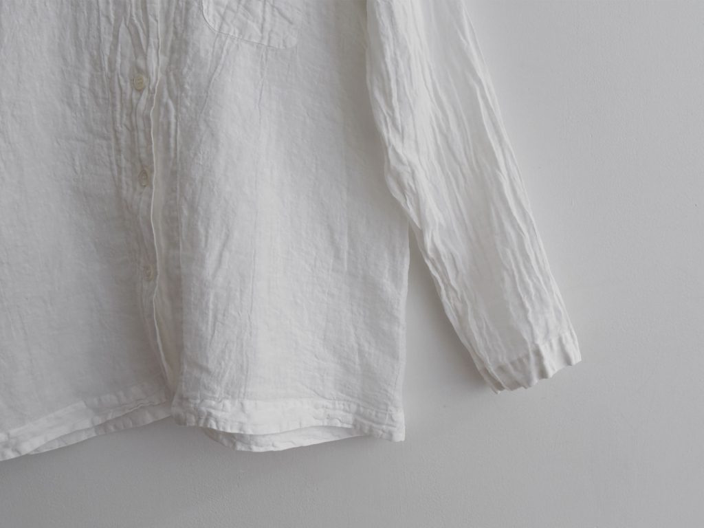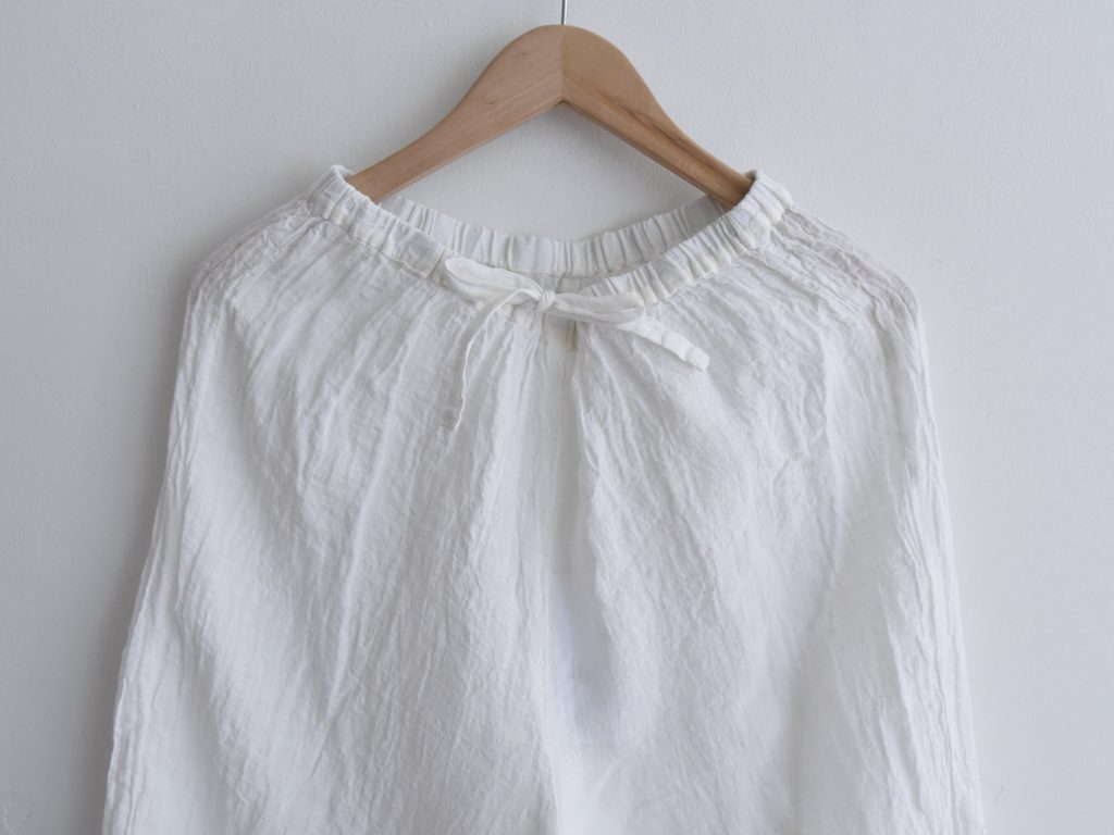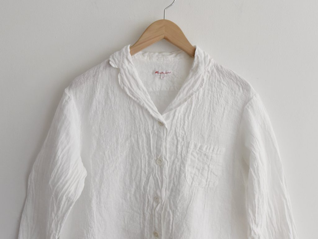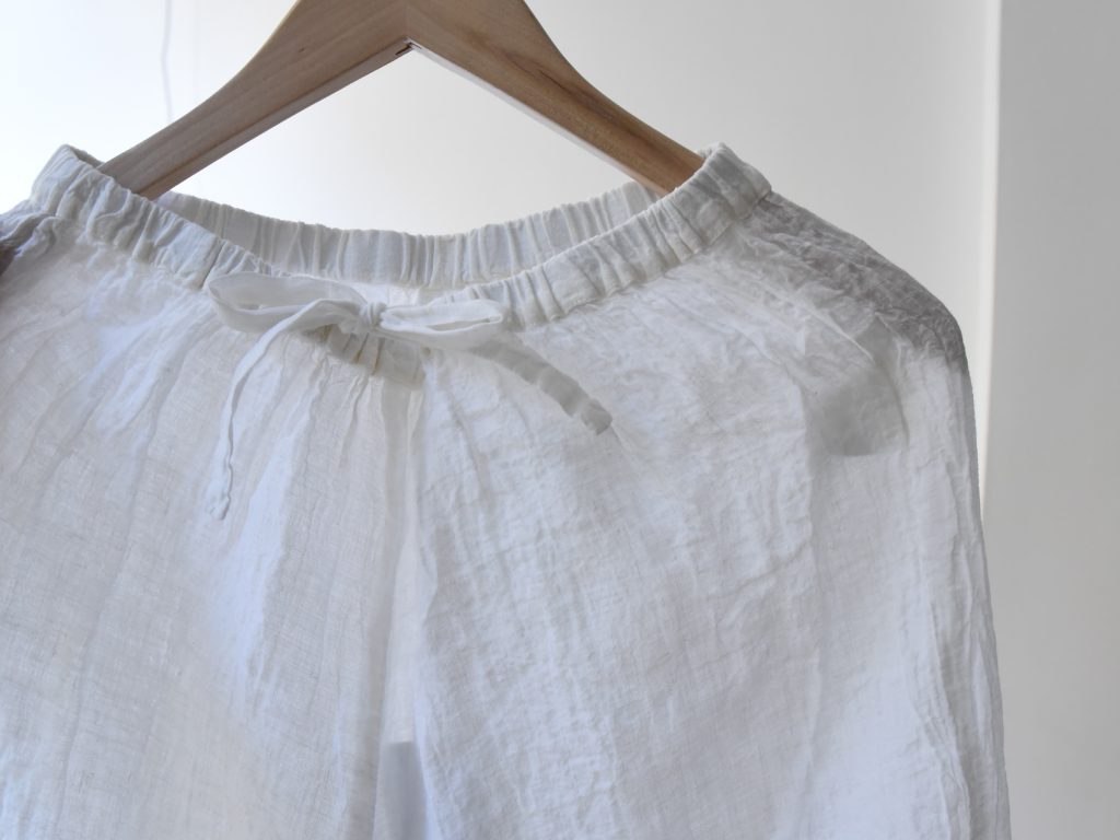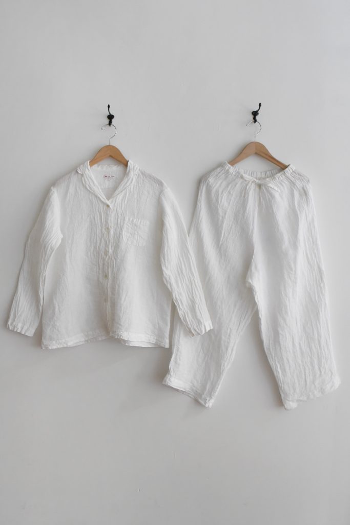 A lightweight linen pajama set with a slightly sheer texture. The top features a pajama collar and one chest pocket, while the pants have an elastic waistband with a drawstring for an adjustable fit.