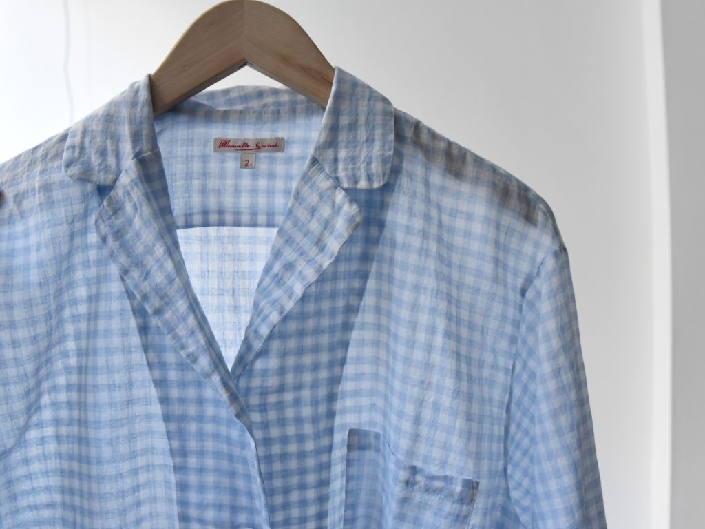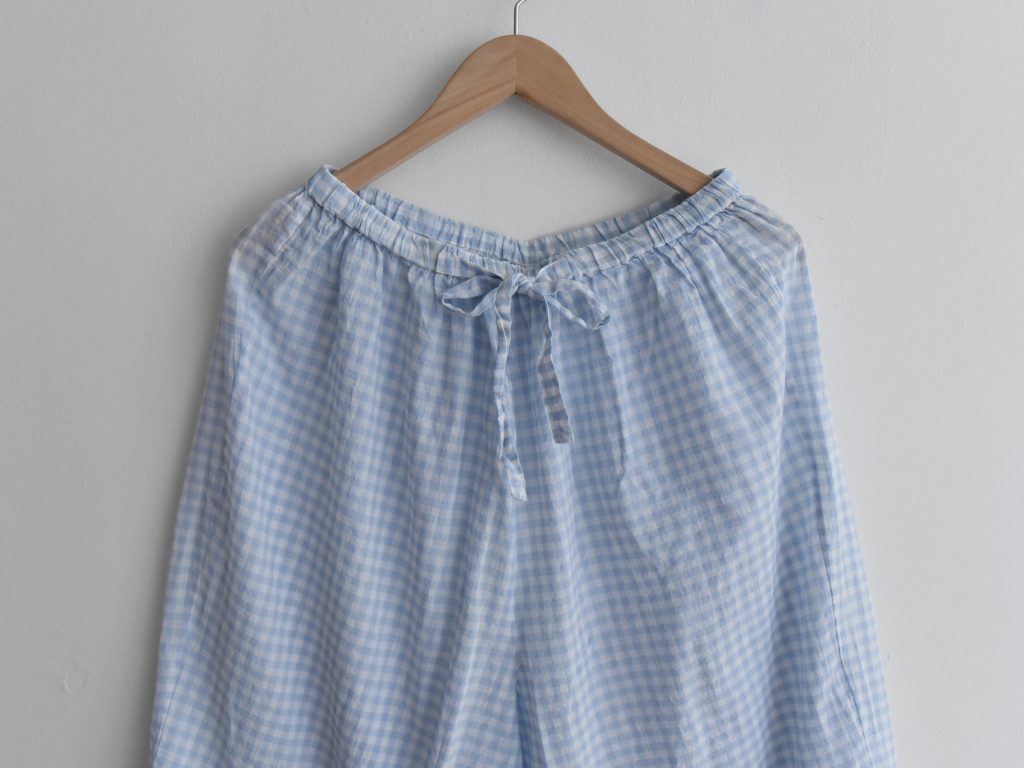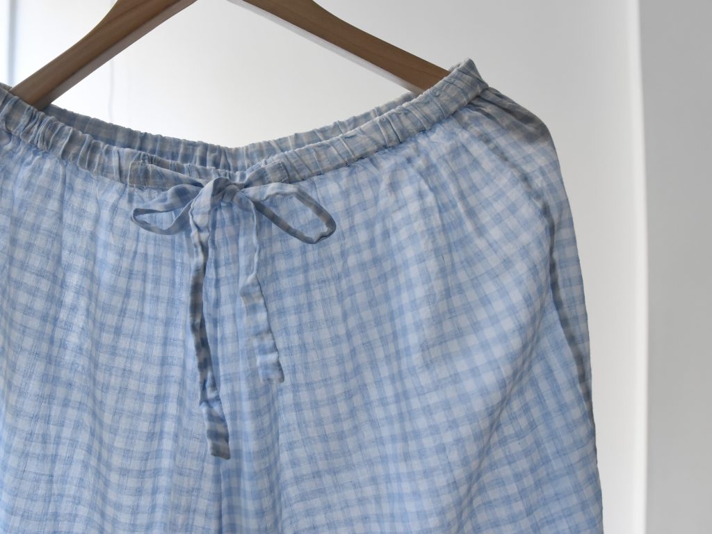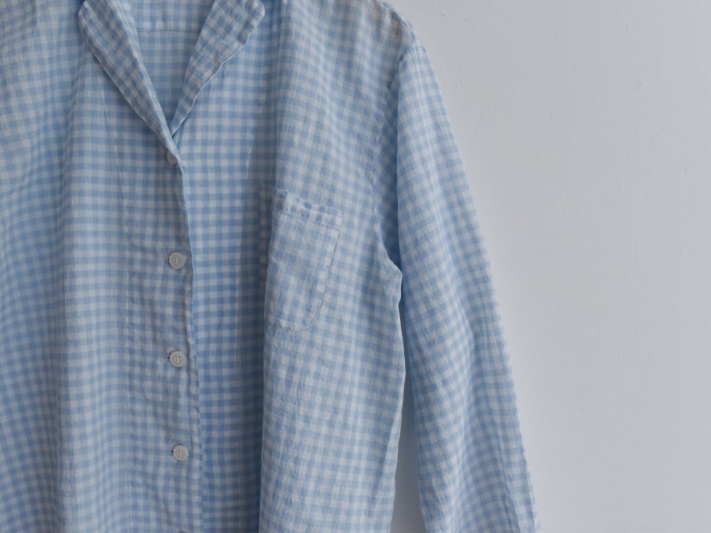 A lightweight cotton pajama set with a sheer texture. The top features a pajama collar and one chest pocket, while the pants have an elastic waistband with a drawstring for an adjustable fit.