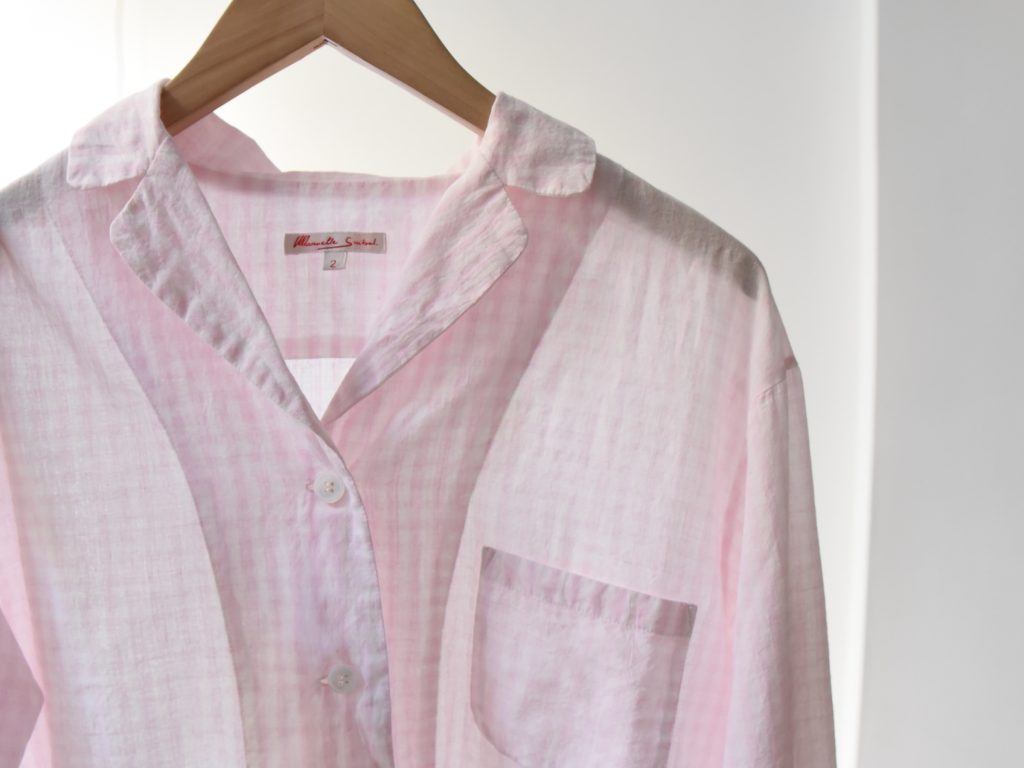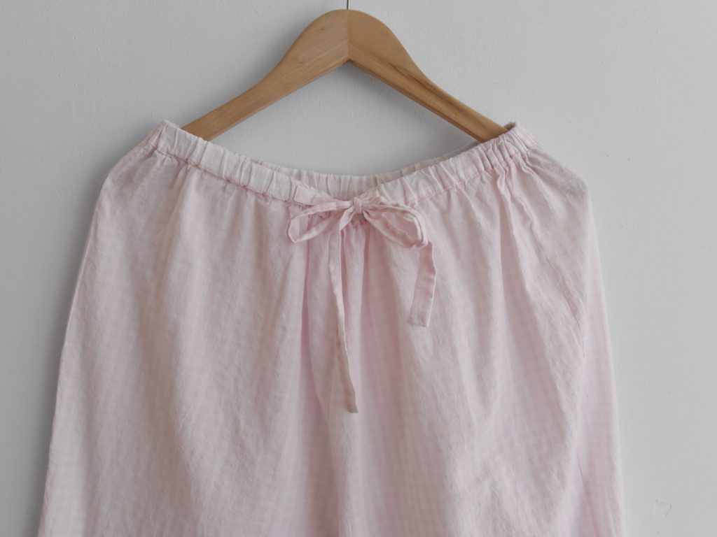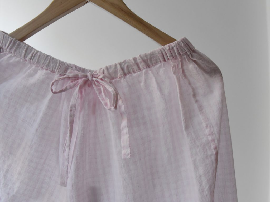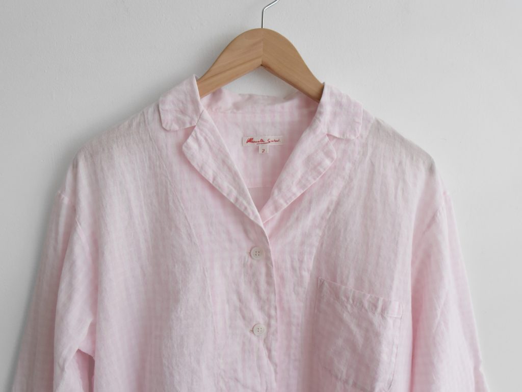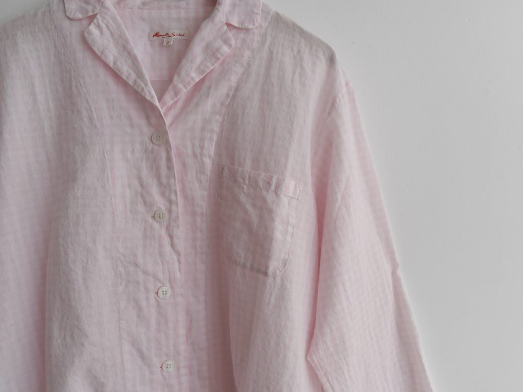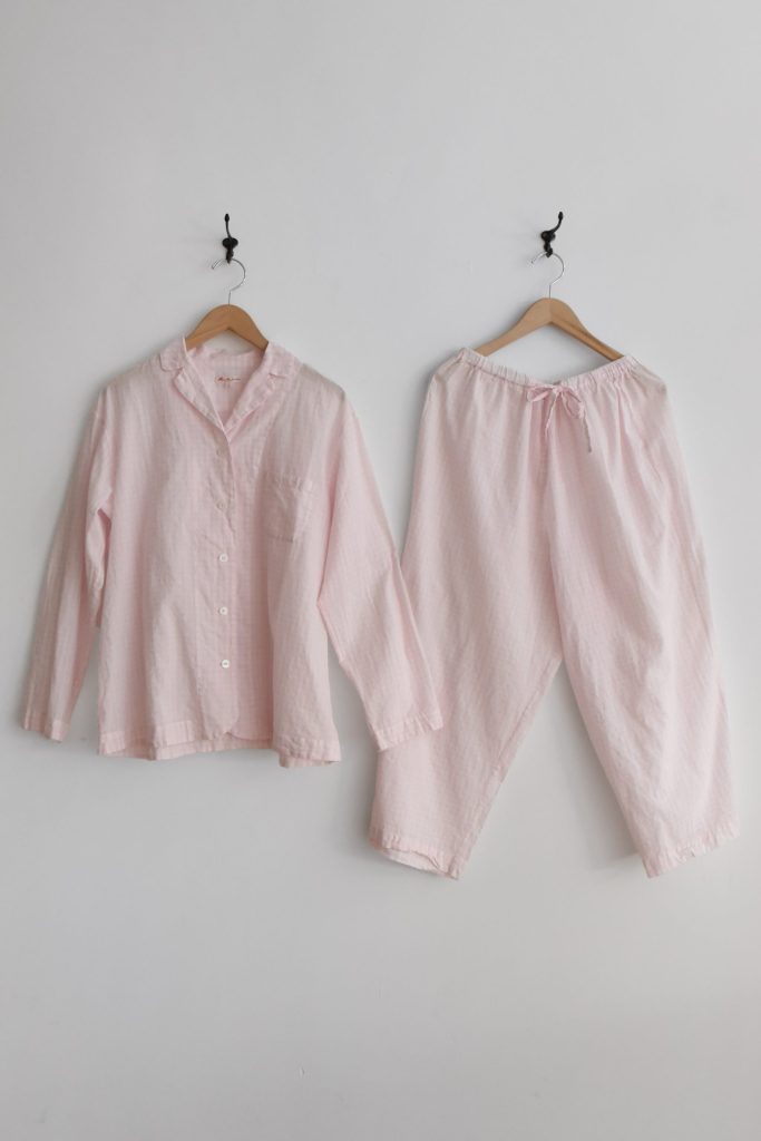 A lightweight cotton pajama set with a sheer texture. The top features a pajama collar and one chest pocket, while the pants have an elastic waistband with a drawstring for an adjustable fit.