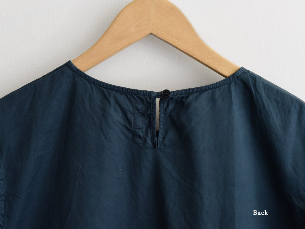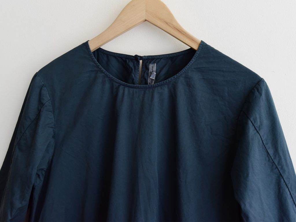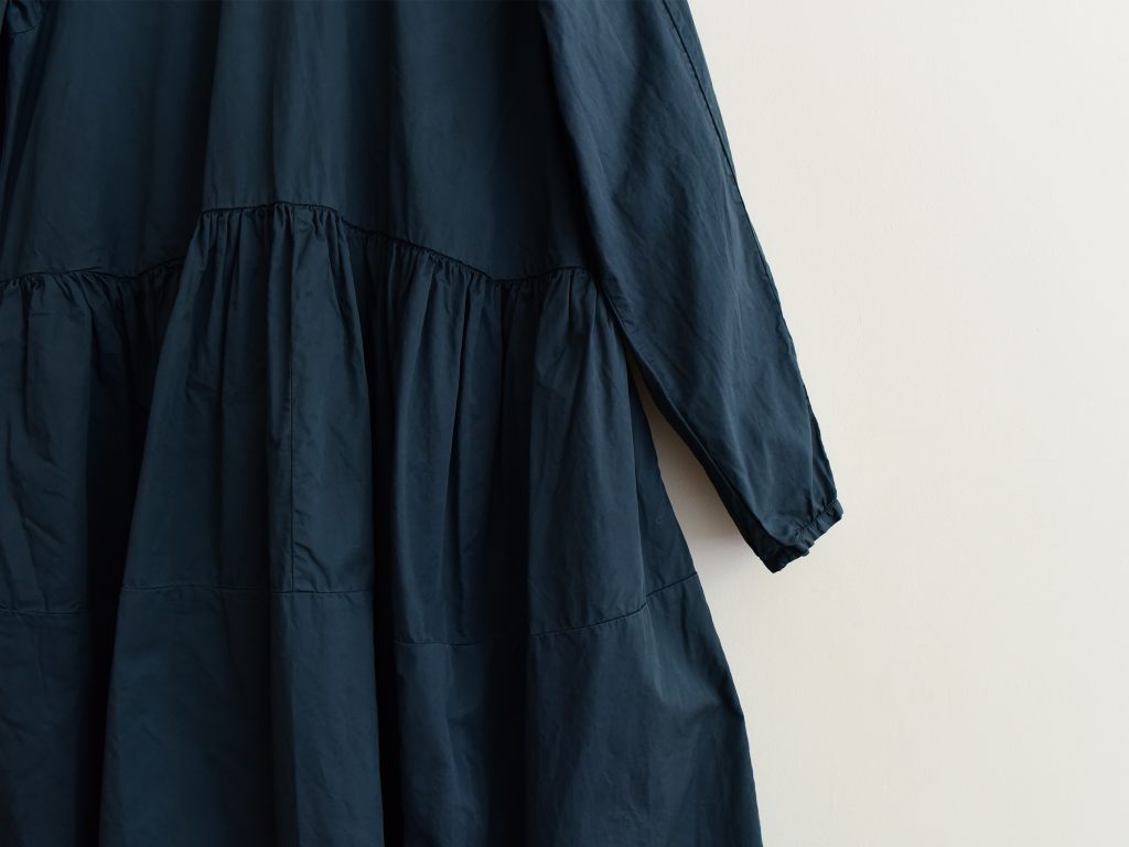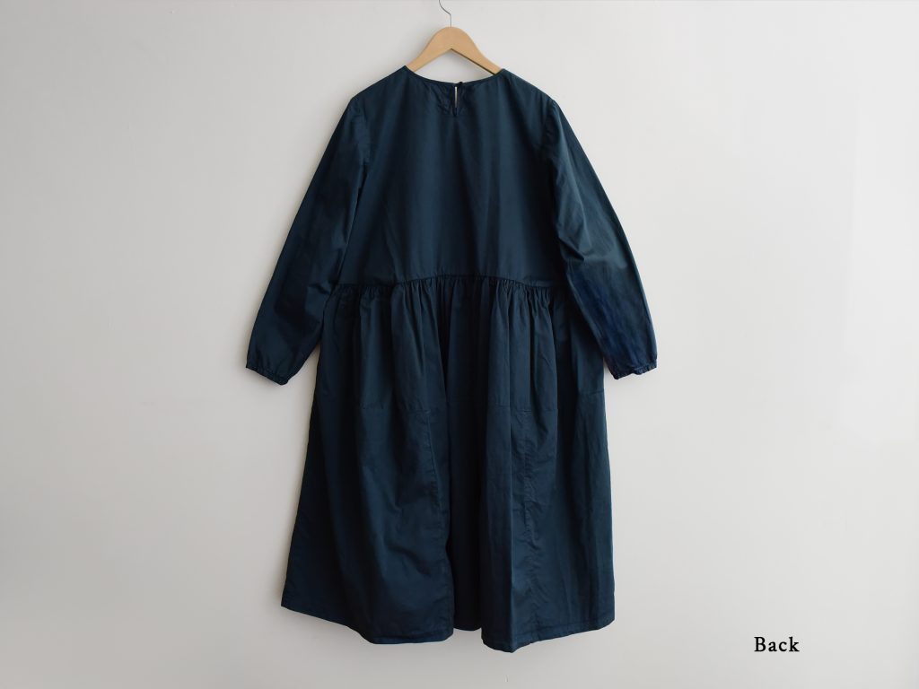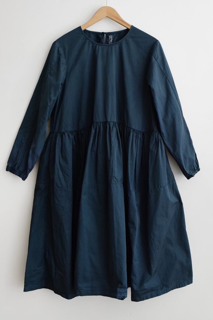 A cotton dress with a crisp, slightly shimmery texture. It fastens with a button at the back of the neck and features two side pockets. The skirt has a gathered seam detail at the waist.