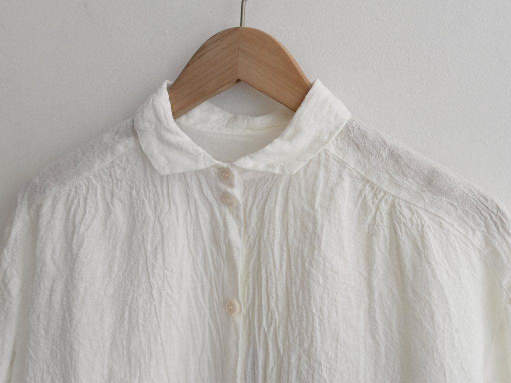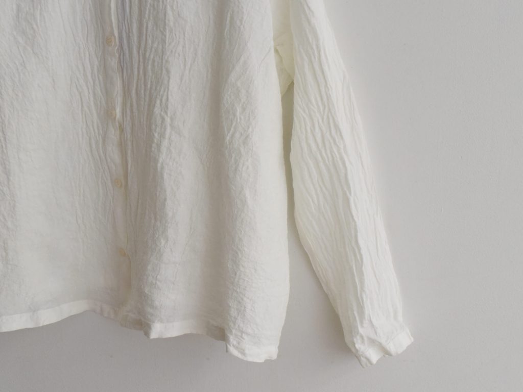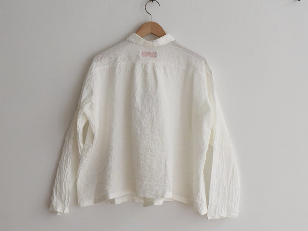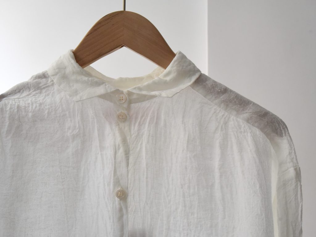 This shirt is made from 100% linen and produced in France. It features a short collar, a front button closure, and a lightweight fabric, and is designed with long sleeves.