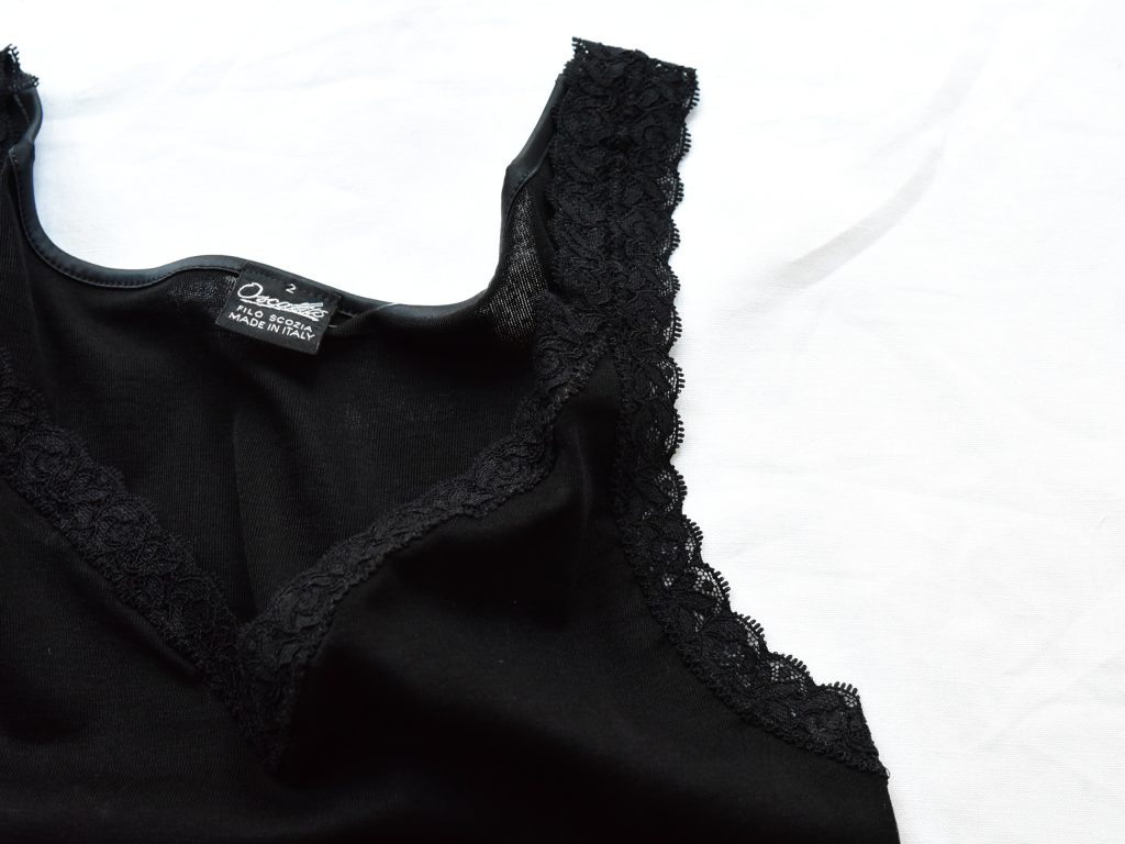 “Made of the finest flat knit fabric in pure Egyptian Makò mercerized Cotton (Filoscozia®)with a gorgeous and feminine French leavers lace.” (www.oscalito.us)