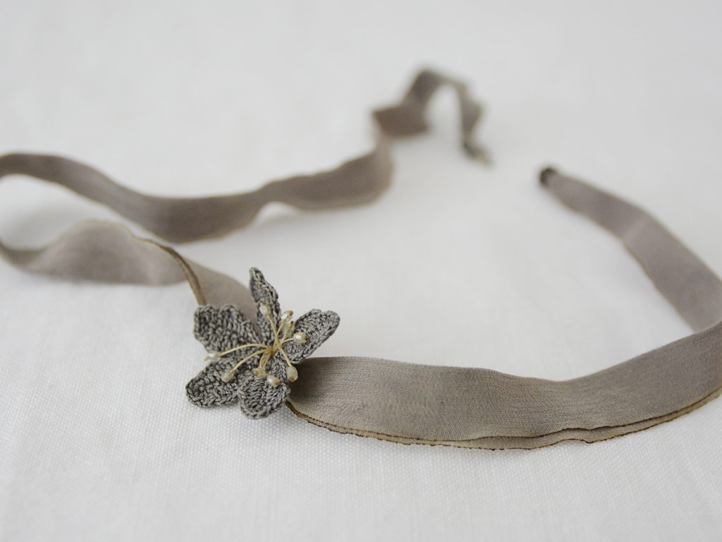 Each petal is hand-crocheted, and antique beads and diamonds are used for the stamens and pistils. The ribbon for wrapping around the wrist is made of silk. It’s a very delicate item, so please handle it with care.