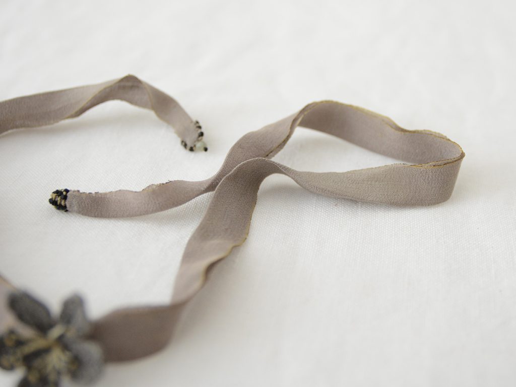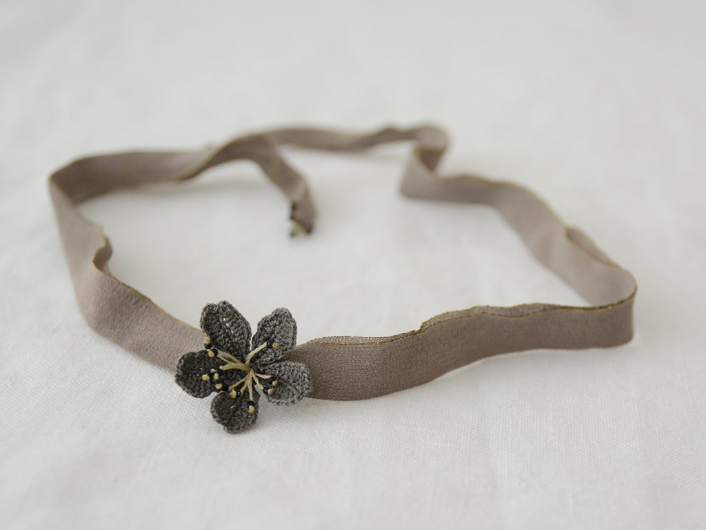 Each petal is hand-crocheted, and antique beads are used for the stamens and pistils. The ribbon for wrapping around the wrist is made of silk. It’s a very delicate item, so please handle it with care.