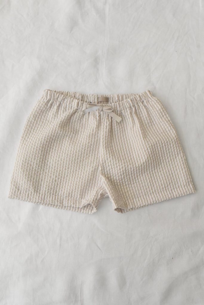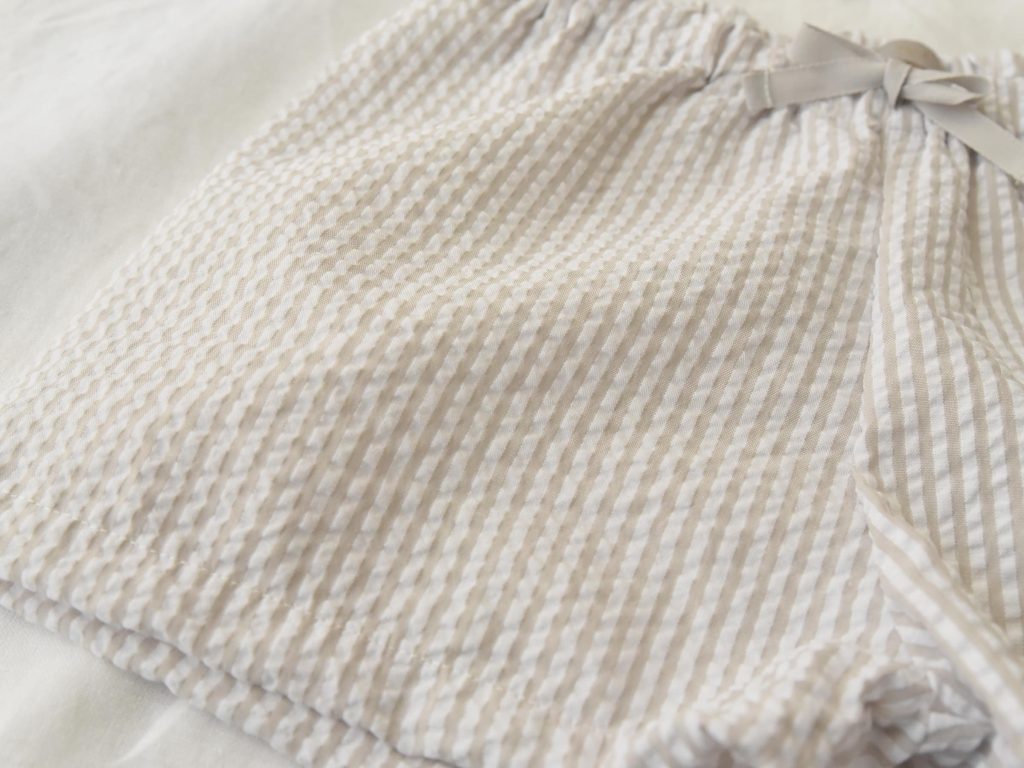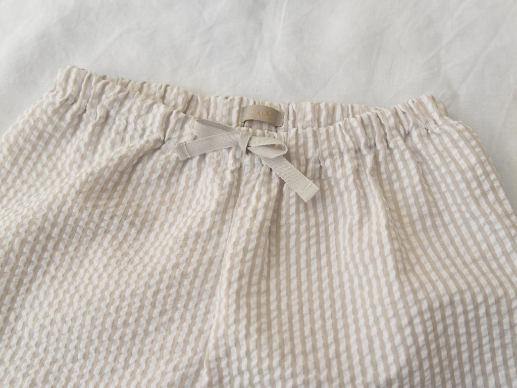 Lightweight striped shorts designed for comfort in warmer weather. Crafted from a cotton and polyester blend, the fabric is breathable, quick-drying, and easy to wear throughout the day. The elastic waistband offers a relaxed fit, finished with a soft decorative ribbon at the front.